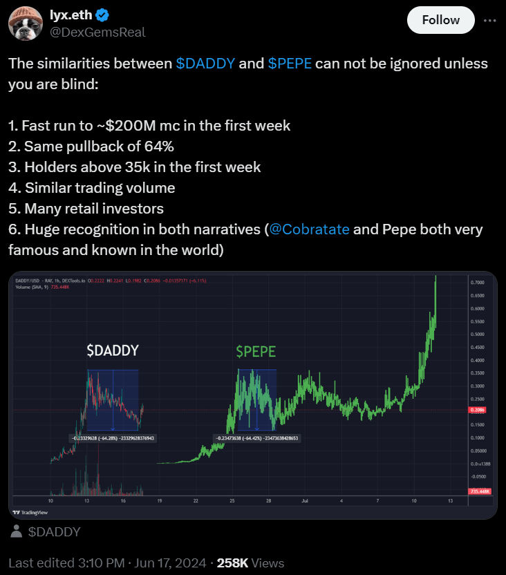 As it happens, the price of DADDY continued to grow, outshining Iggy Azalea’s MOTHER coin, after Tate’s X post that he has “never seen mommy beat DADDY,” as well as his announcement regarding plans to turn this crypto asset into a utility token, as per data on June 18.