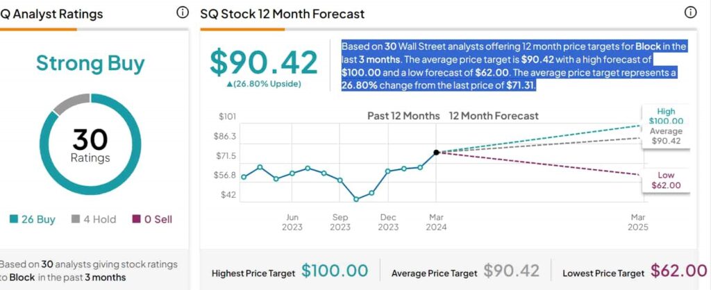 This range indicates a potential upside of 26.80% from the current share price of $71.31. These projections reflect varying degrees of confidence in Block’s strategic direction and its potential impact on the company’s future profitability and market position.