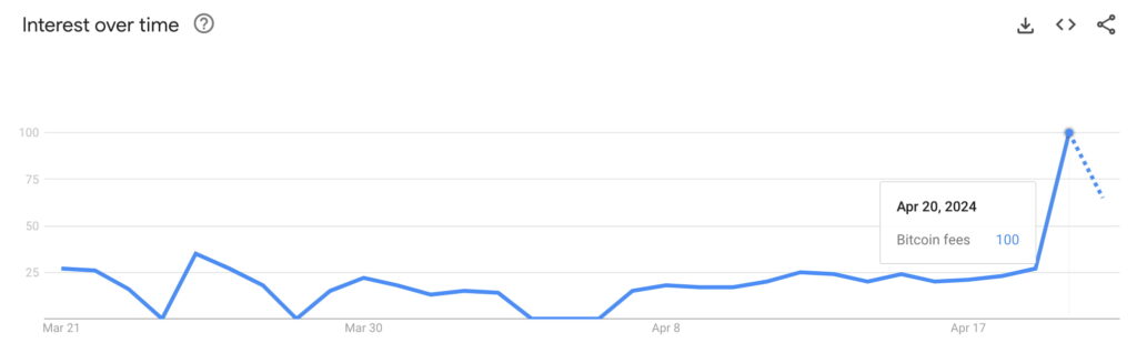 Notably, on April 20, the one-month interest rate for “Bitcoin fees” rose to its maximum in Google Trends. Until then, searches scored a consistent sub-25 interest—a low interest also kept in higher time frames.