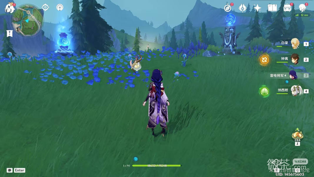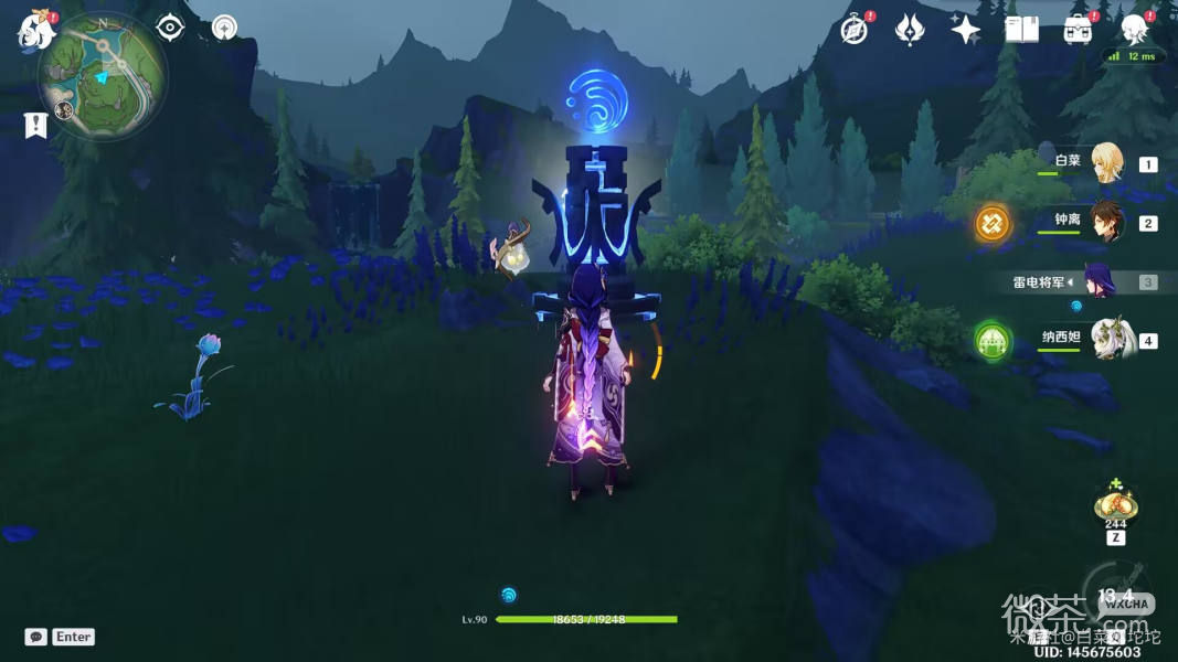 哦,對了。再往坡下走也有一個封印的寶箱,走進會出現兩個水元素丘丘薩滿和兩個水史萊姆,直接走到寶箱那裏,讓丘丘薩滿的下雨法陣覆蓋三個水量偵測晶體就可以開啓寶箱啦。