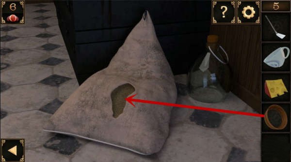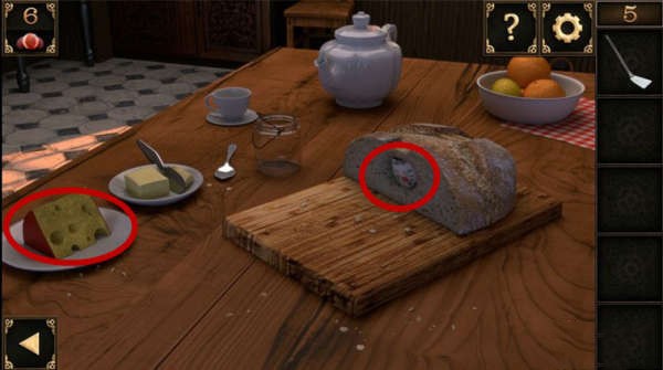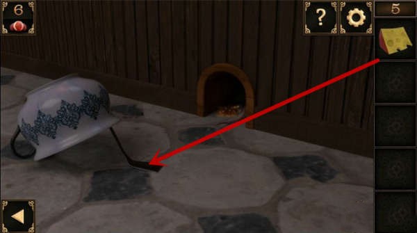 10、在窗戶下方有個洞。將裝有鍋鏟的大碗放在洞前面,再把奶酪放在鍋鏟上,洞裏面的老鼠就會中計被壓在大號碗裏面,然後取走洞裏的鑰匙