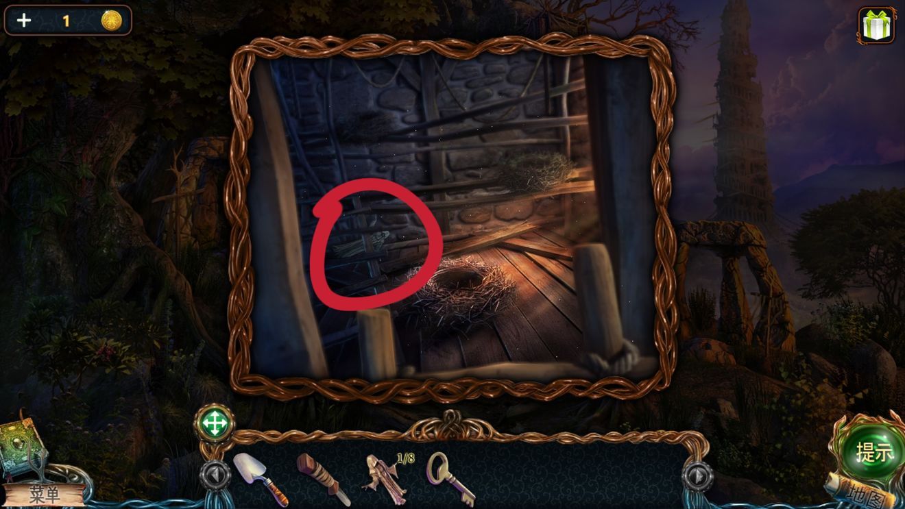 2.將梯子架上閣樓,拿刀柄,鳥巢裏有鑰匙,提示需要把鴿子引出來才能拿到