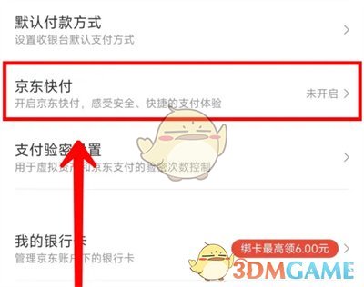 3、接下來在支付設置界面裏有一個“京東快付”,在它的後面點擊“未開啓”的圖標進入開啓。
