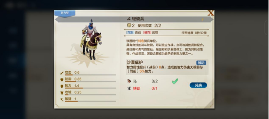 被動方面,二者則各有特色,“輕騎兵”有一定無視智力的能力,與智力隊戰鬥時可無視對方的5%智力,與高智力隊戰鬥時更有優勢。