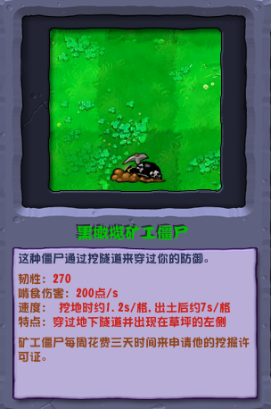 種僵屍通過挖隧道來穿過你的防禦。礦工僵屍每周花費三天時間來申請他的挖掘許可證,可以使用坑洞堅果進行防禦,或者磁力菇把他的鎬子吸走。