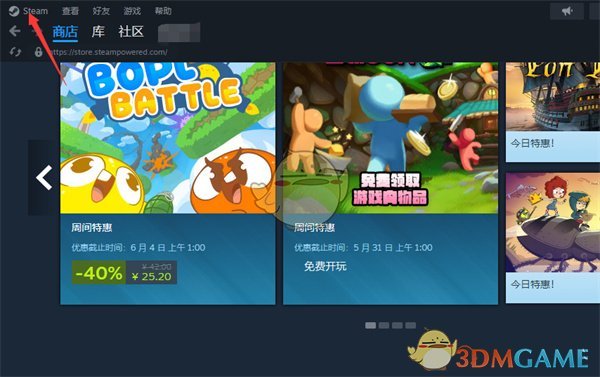 2、進入steam首頁後,在最上方的灰色小字菜單欄點擊【Steam】。