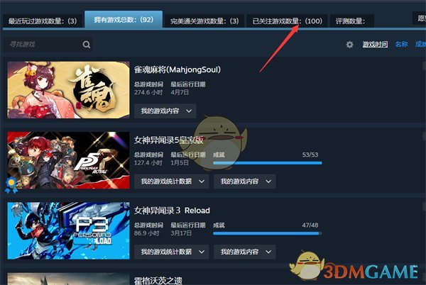 3、在列表中找到【已關注遊戲數量】,點擊打開,就可以看到自己關注的遊戲內容了。