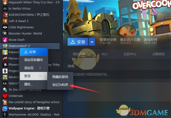 3、右鍵點擊該遊戲,在彈出的菜單欄中選擇【管理】-【標記爲私密】即可。