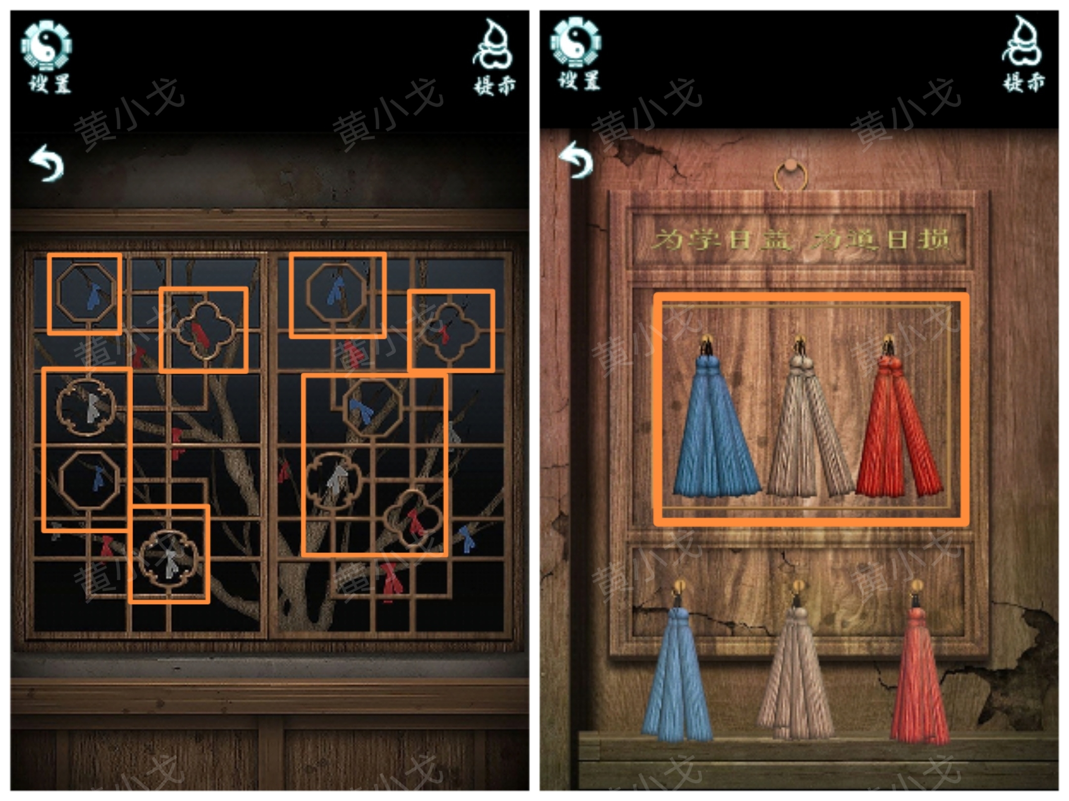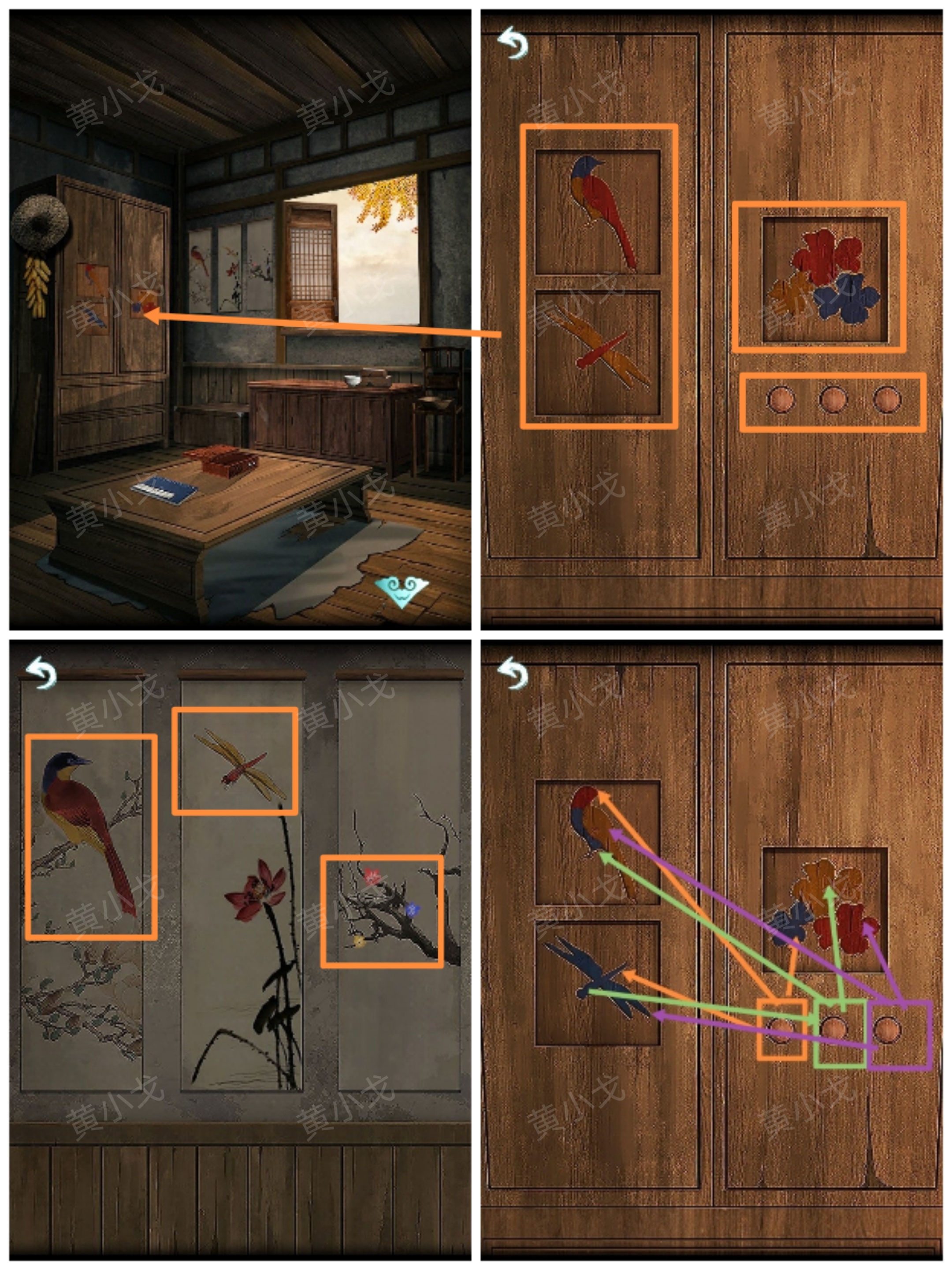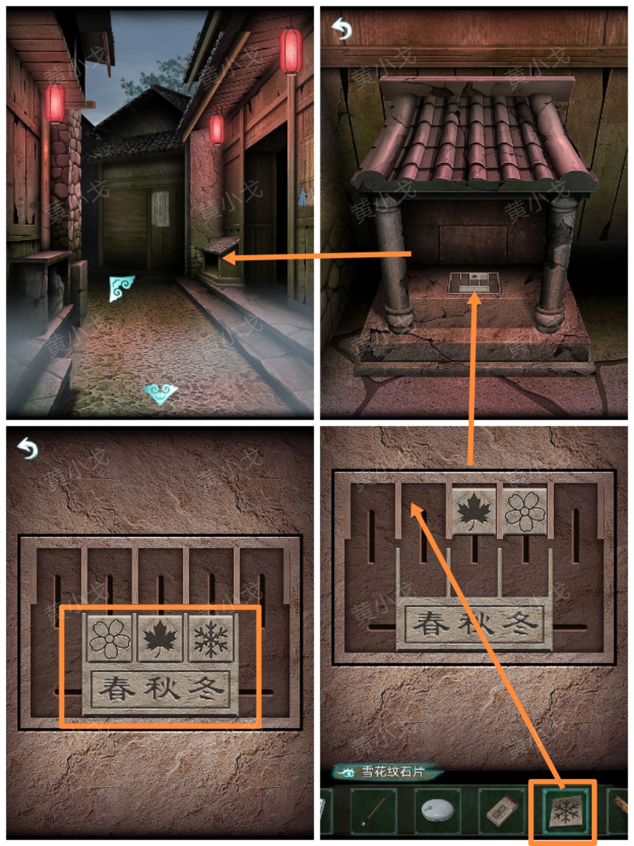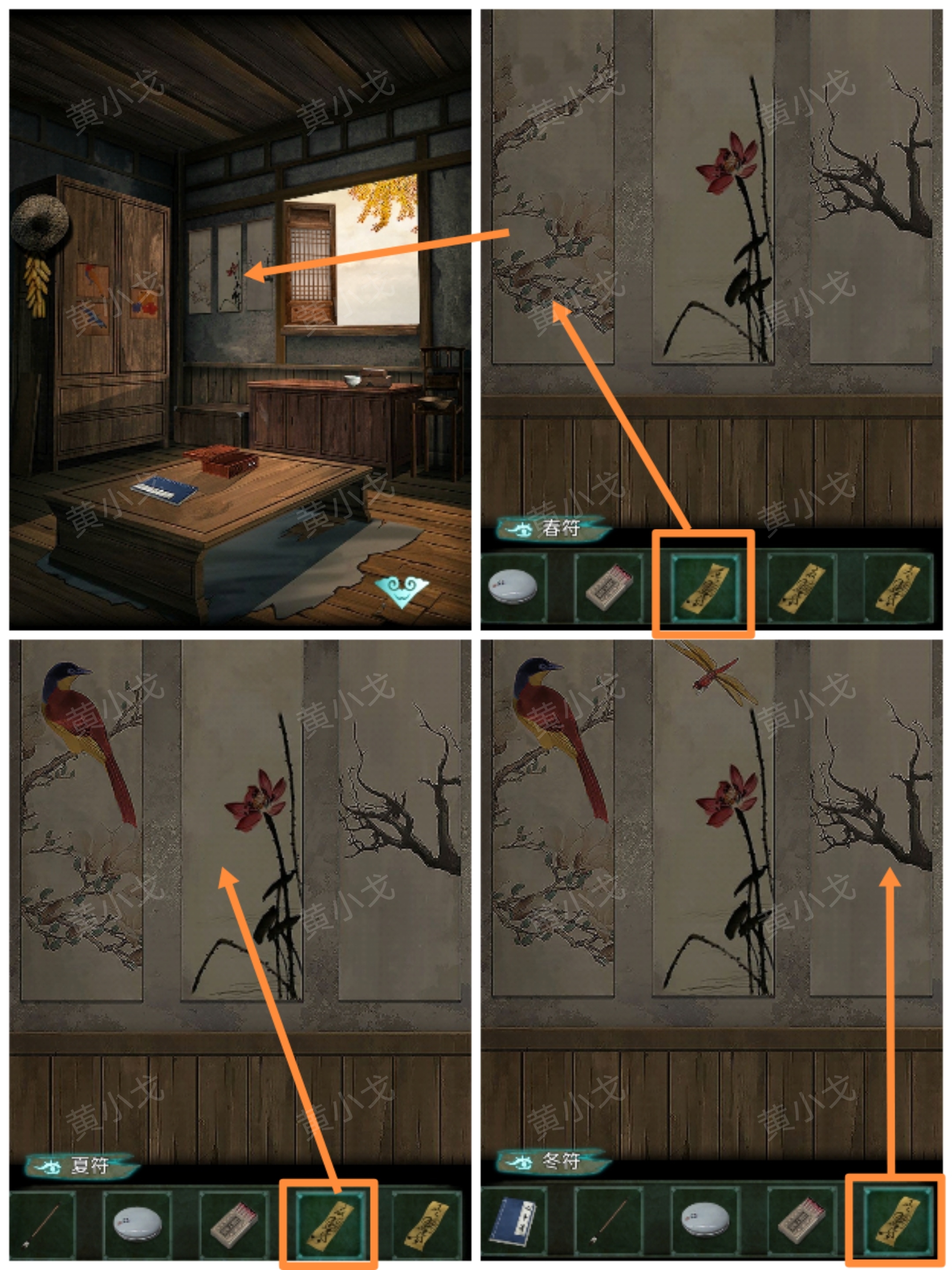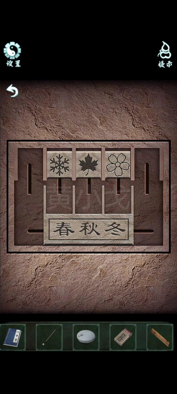 21.(老屋-裏屋)點擊牆上的挂畫,根據上面的植物分別貼上【春符】、【夏符】和【冬符】,獲得線索