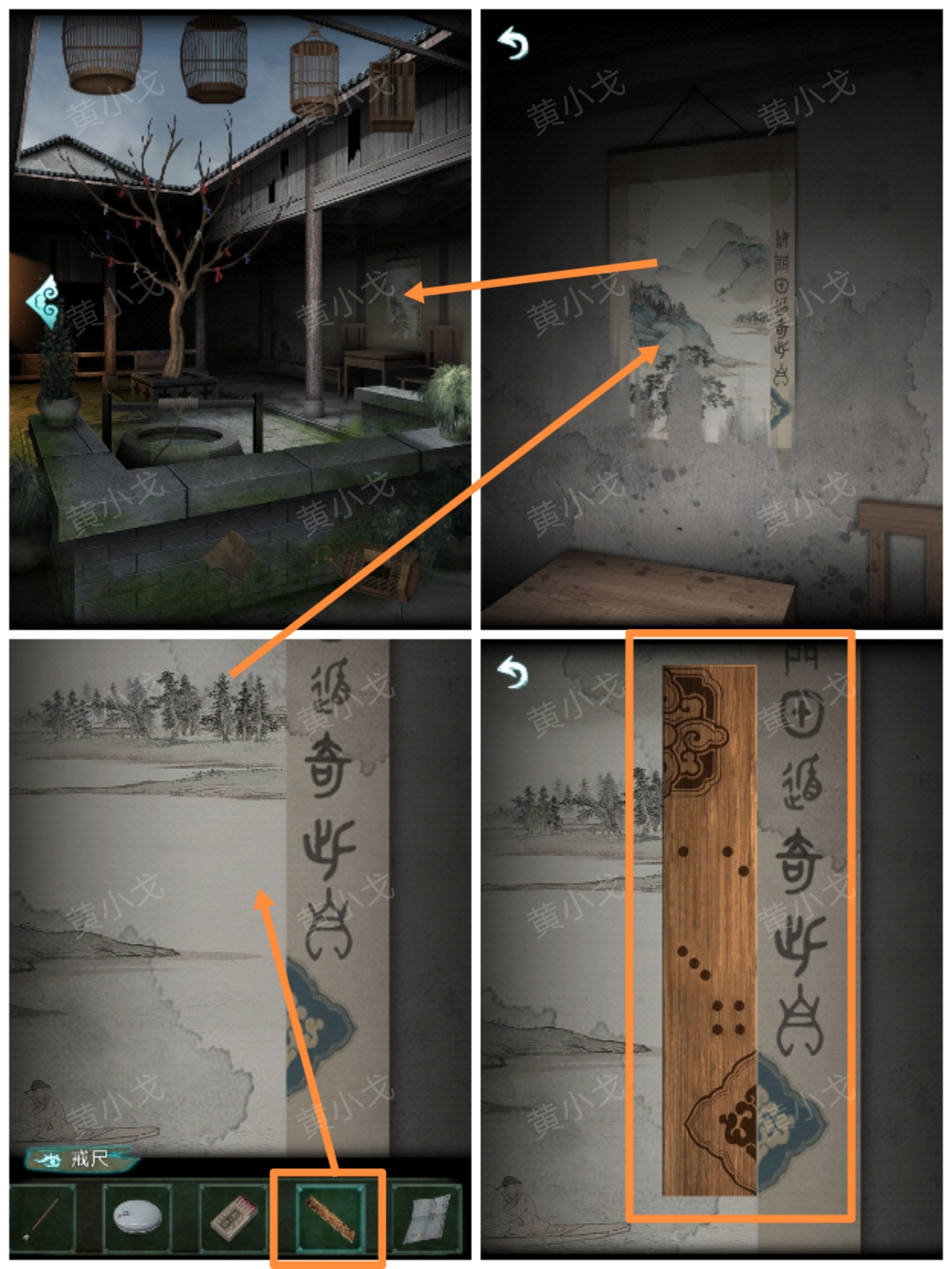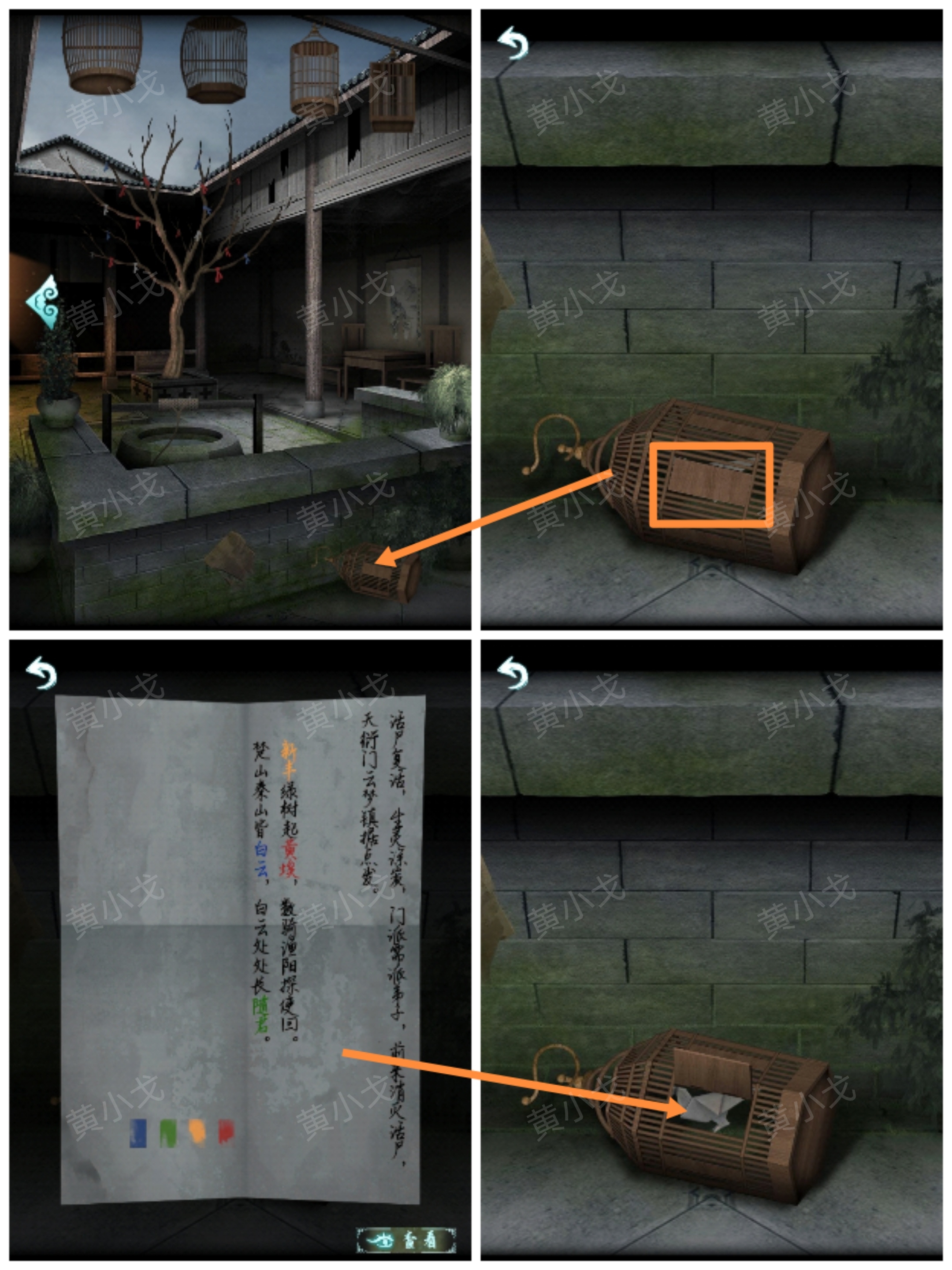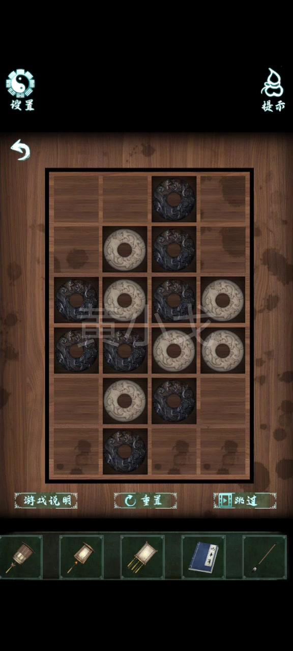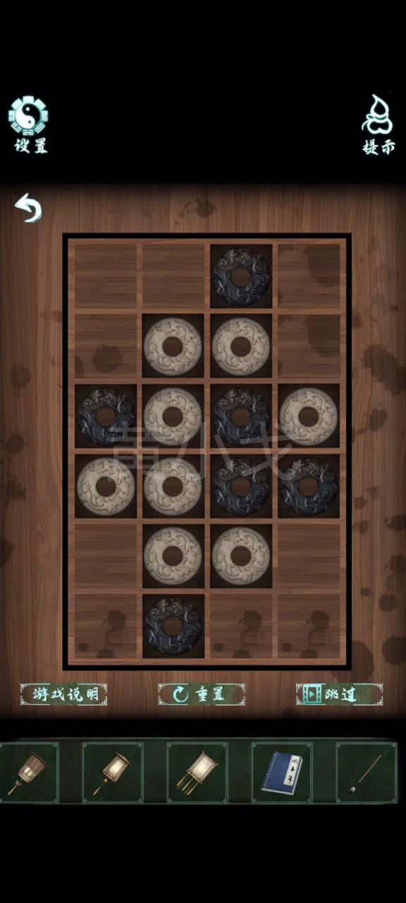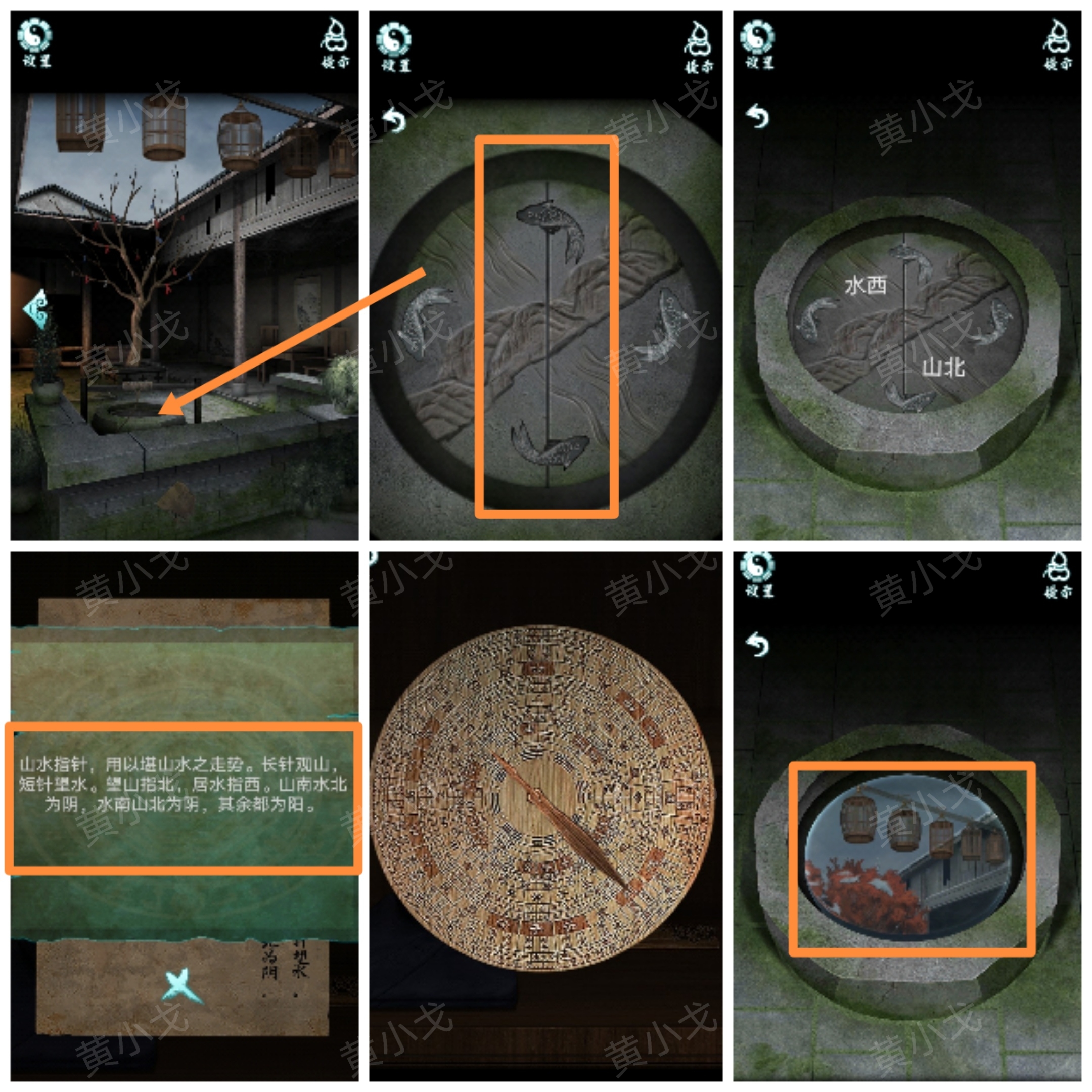 6.(院子)點擊水井,根據紙條上的線索和羅盤上的短針個長針的指向,找出方位;按下中間兩條魚爲陰,觸發劇情,在水井裏獲得燈籠排列位置