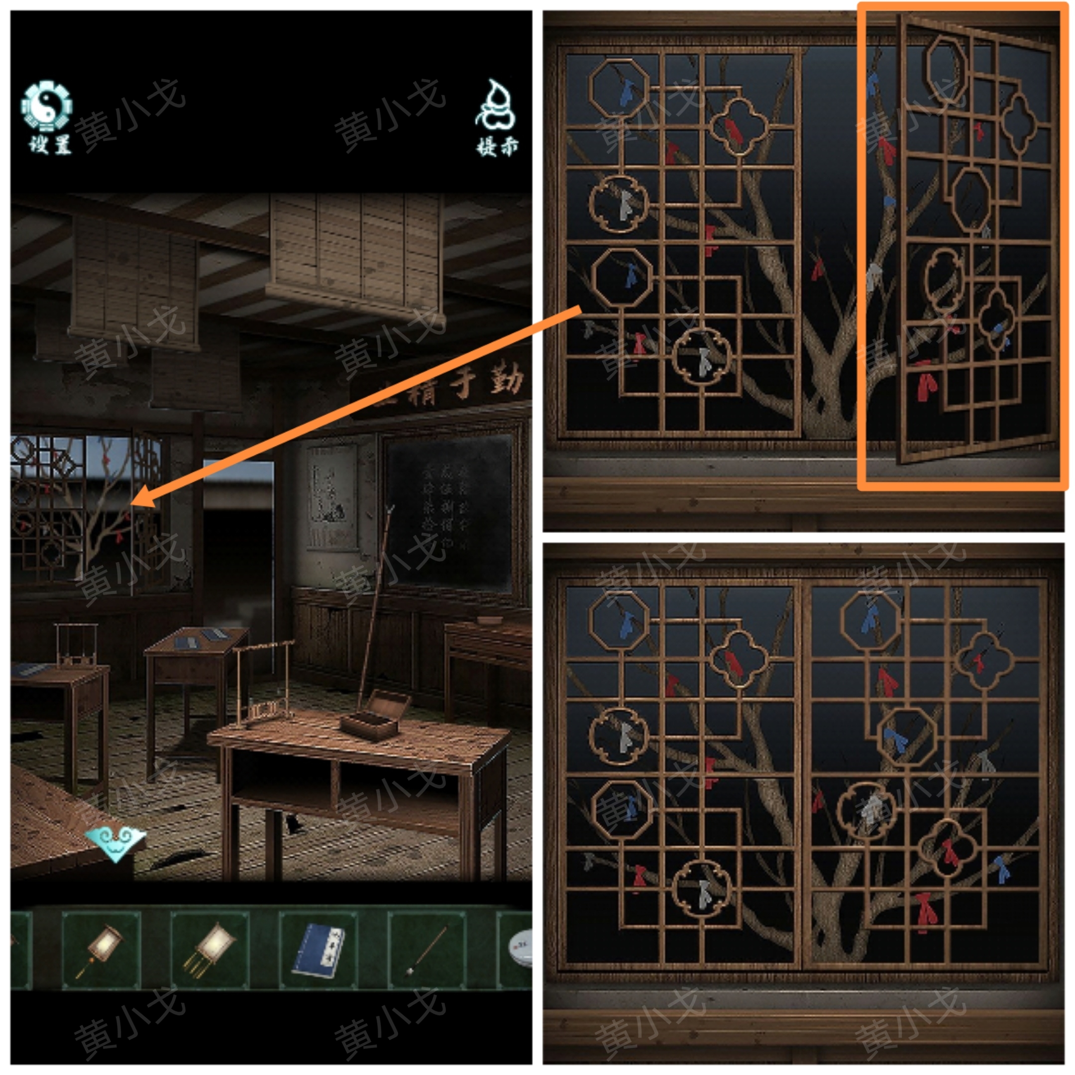 4.點擊窗戶,關上窗,獲得線索(在框裏的布條的顔色及數量)