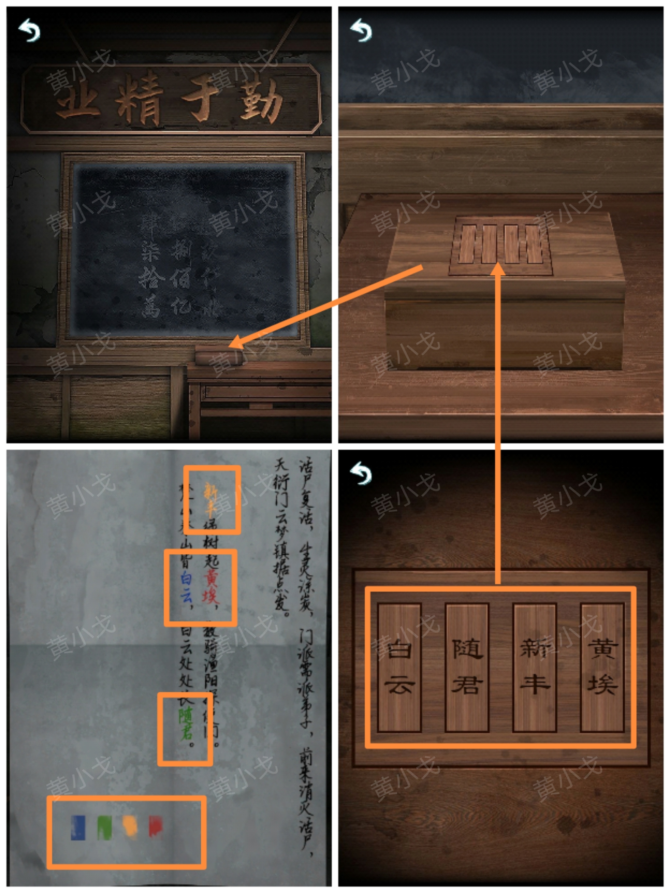 10.(私塾)點擊講桌上的盒子,根據【紙鳥】上的線索,調整盒子上的機關(順序:藍綠橙紅、藍-白雲、綠-隨君、橙-新豐、紅-黃埃)