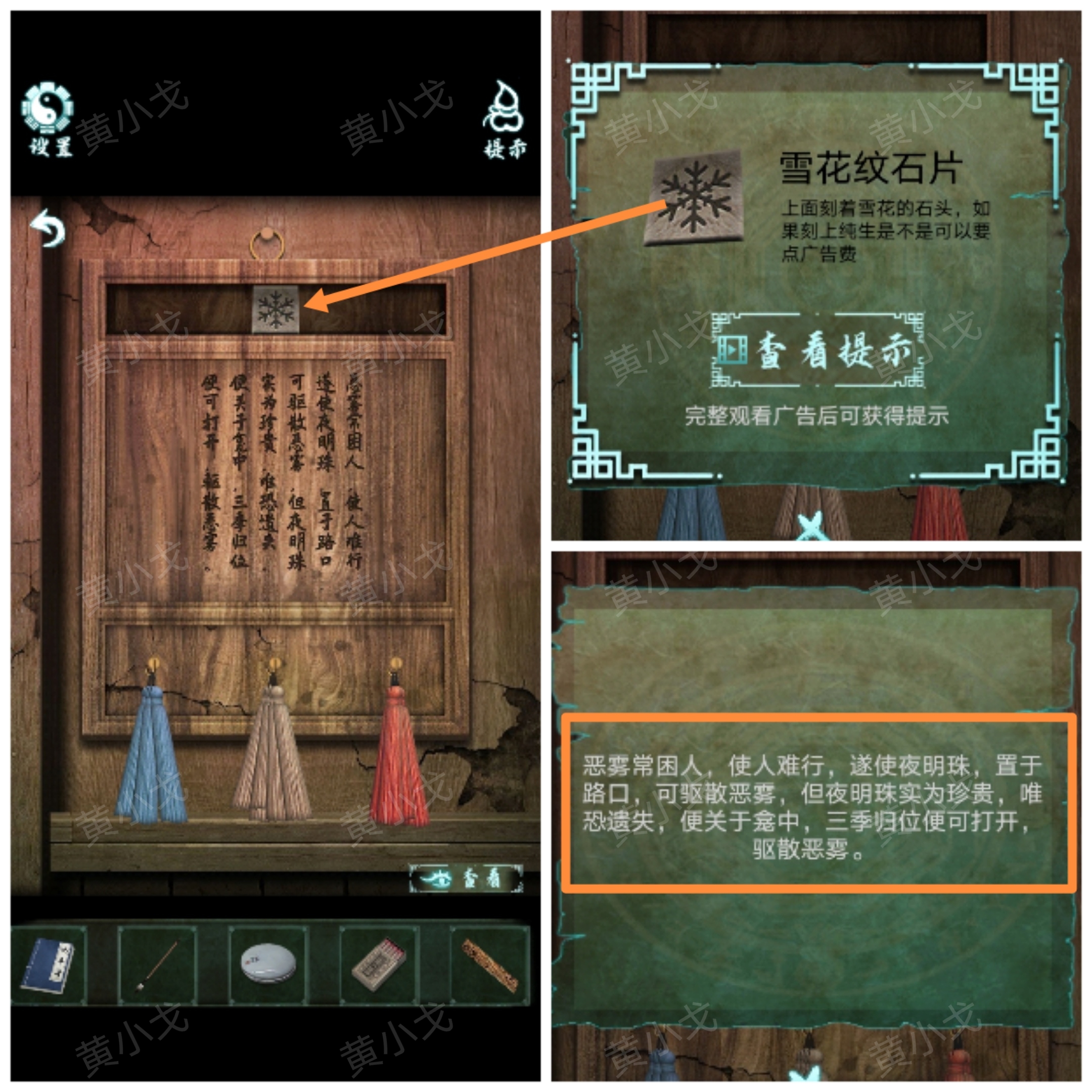 14.打開暗格,獲得【雪花紋石片】,查看刻字