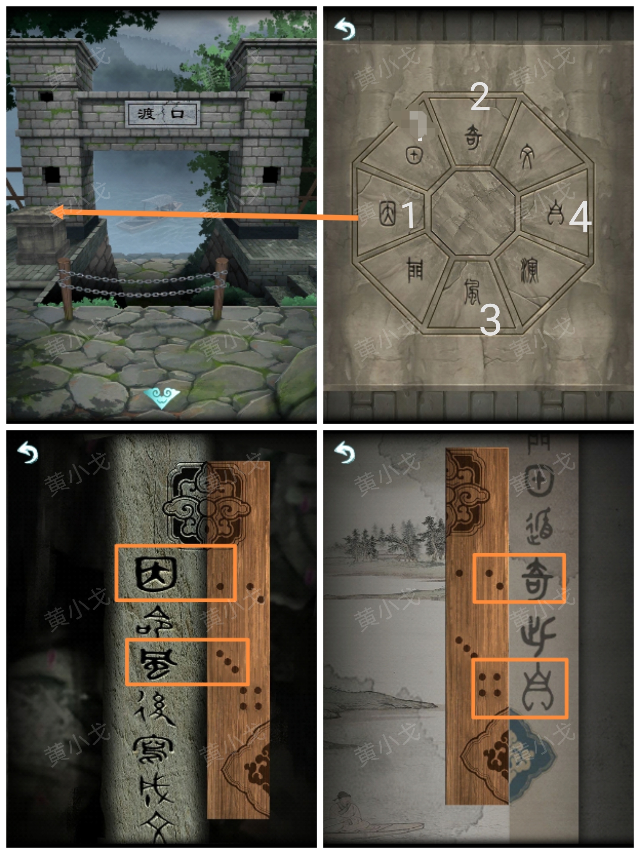 18.(渡口)點擊石台,根據挂畫和土地公石廟上的線索,按順序按下字石塊