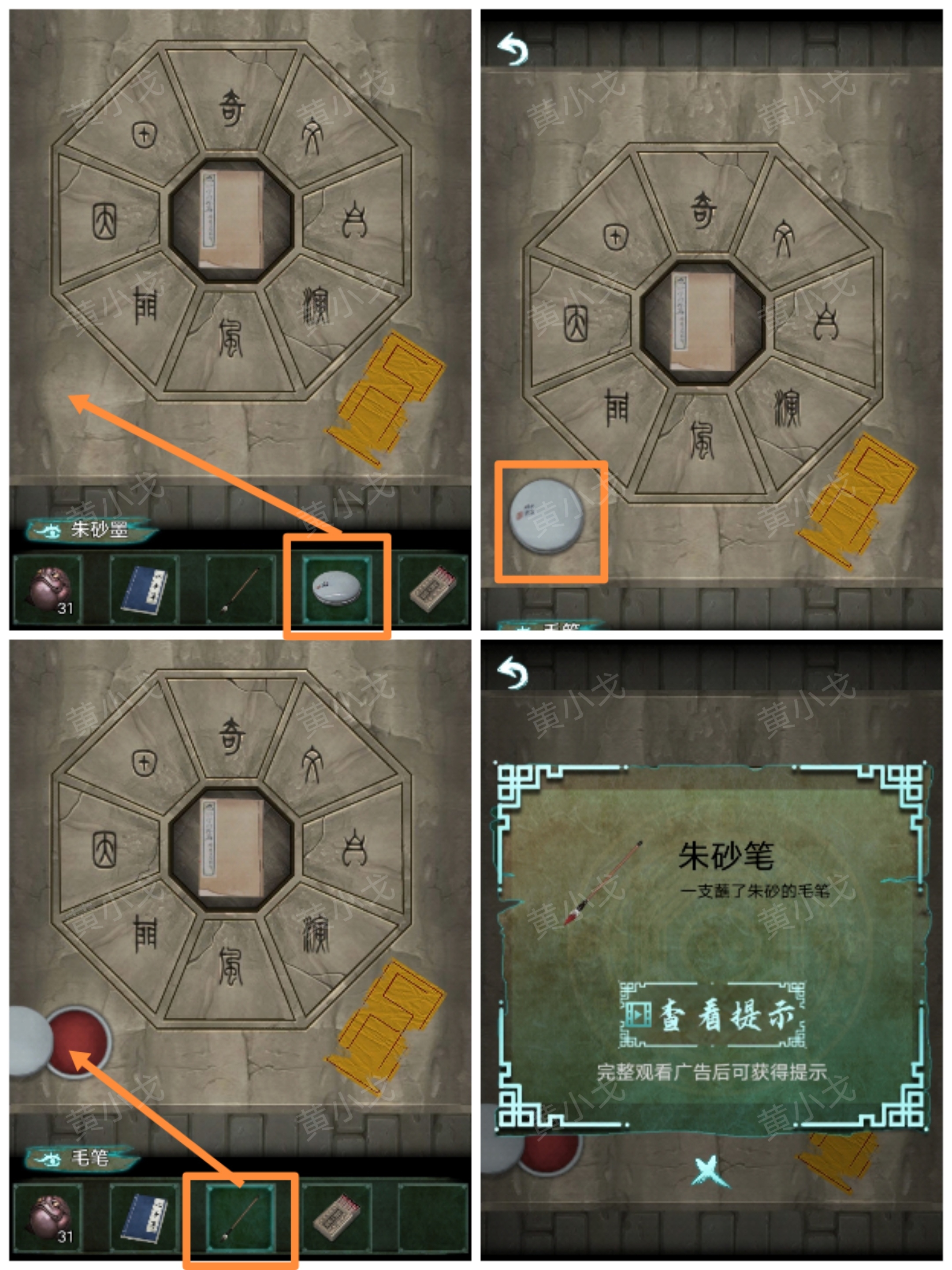 20.把【朱砂墨】放到石台上,打開蓋子,用【毛筆】蘸朱砂,獲得【朱砂筆】