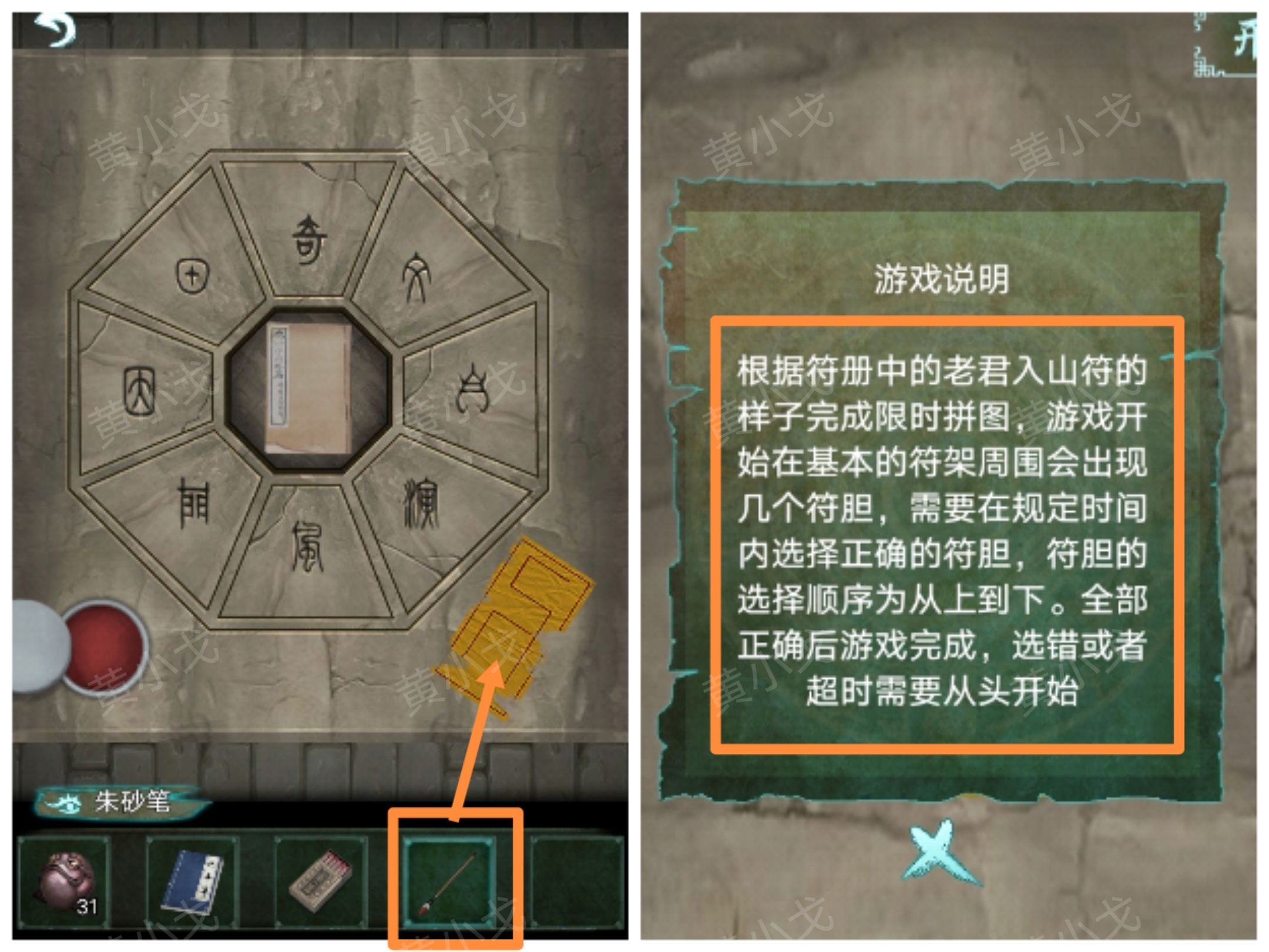 21.用【朱砂筆】畫符;查看遊戲說明,根據書上的符咒樣式,完成小遊戲