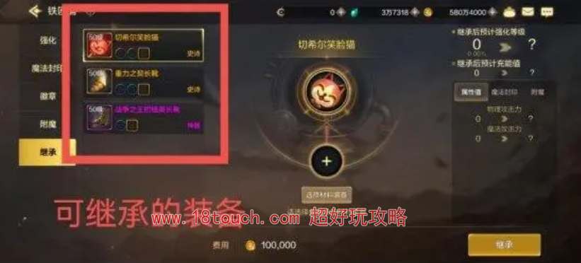 2、繼承固定消耗10萬金幣,如下圖所示,在界面中選擇裝備以及詞條,在上方放入繼承屬性的裝備,然後按照提示消耗材料就可以完成打造了。
