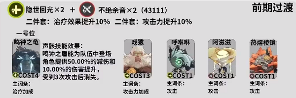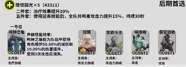 前期使用43111過渡,因爲鳴鍾之龜的聲骸技能效果是鳴鍾之盾能爲隊伍中登場角色提供50%的減傷和10%的傷害提升,受到三次攻擊後消失,所以可以作爲一號位的首選。