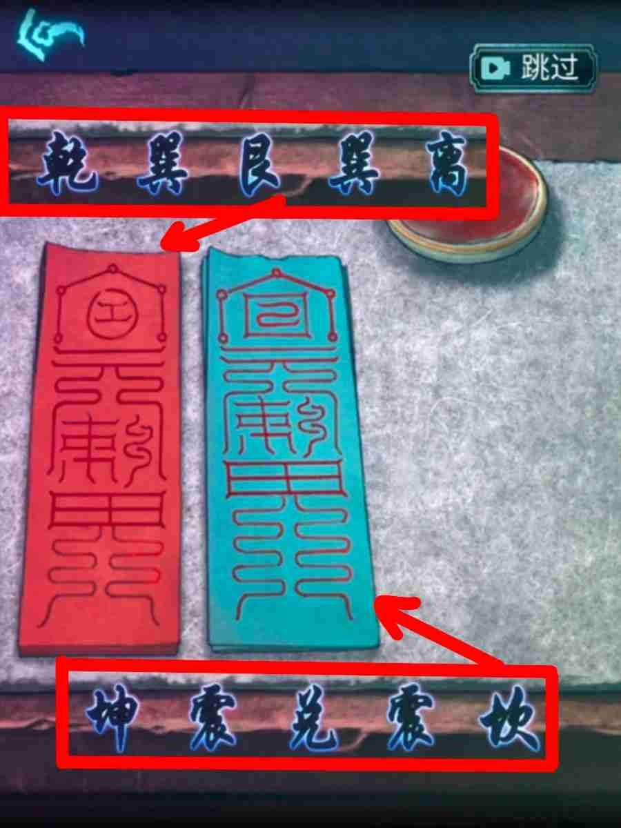 9、回到正廳,根據印香流程制作香,得到了一塊印香。在火盆裏放入:1個元寶和3張紙錢,掐指,切換場景,回到院子,樹上找到了一個香囊和一張線索,打開香囊得到了一些朱砂,根據線索完成地上的小遊戲,機關升起。回到正廳,把朱砂放進桌子上的小碗裏,完成畫符。