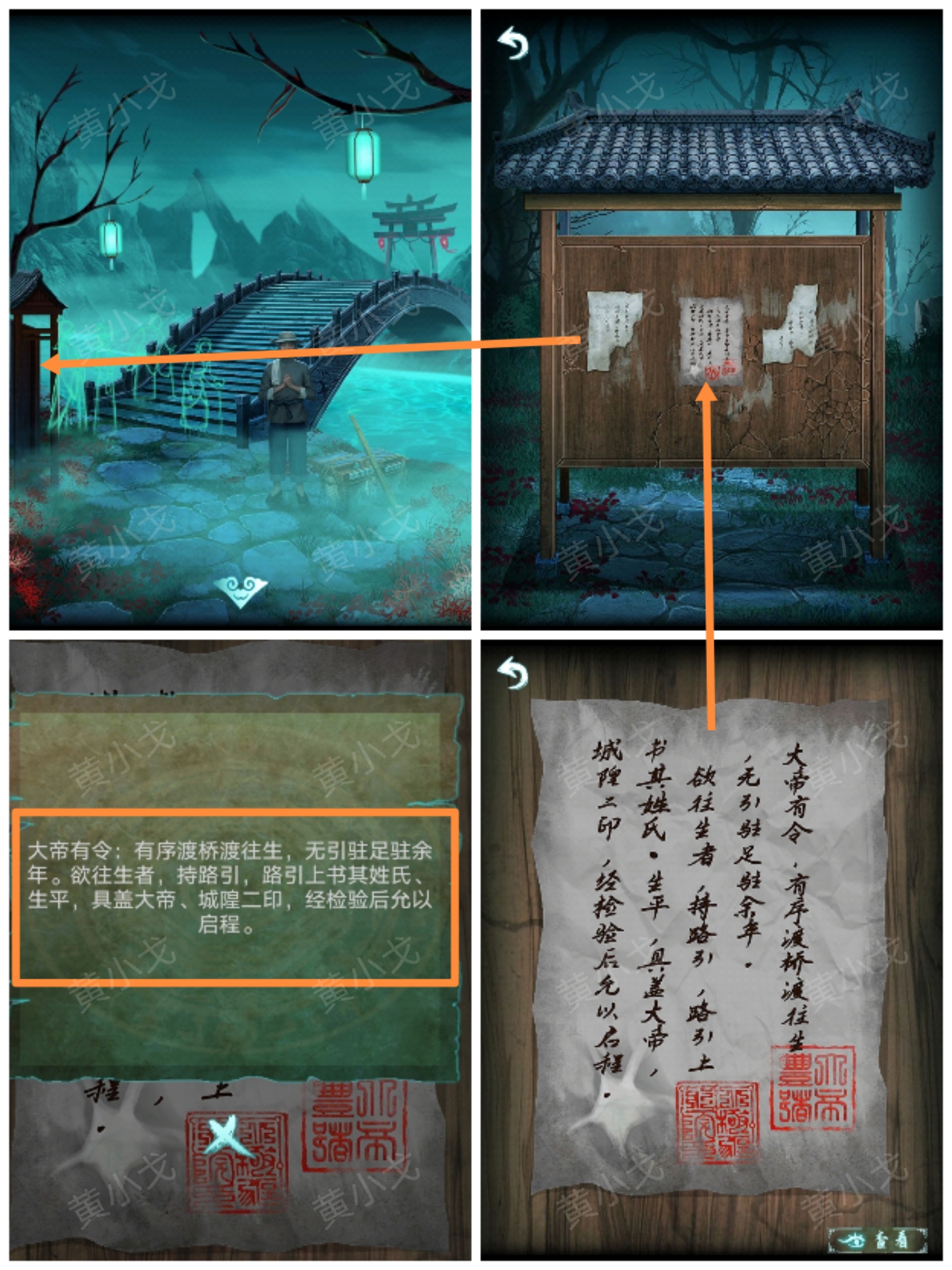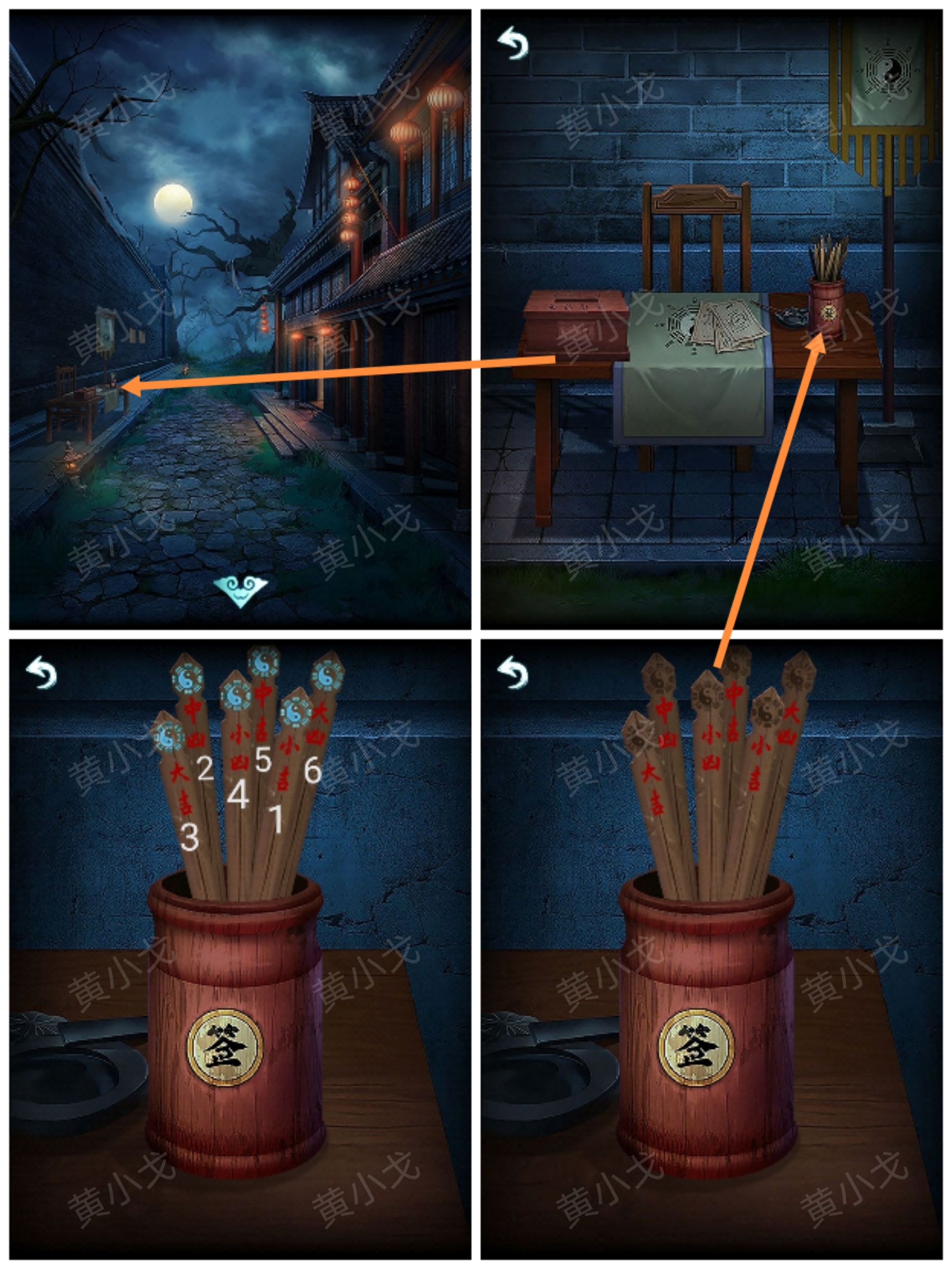 1.(酆都門右側)點擊卦攤上的簽筒,搖簽,獲得線索(八卦圖案亮起的順序:小吉中凶大吉小凶中吉大凶)