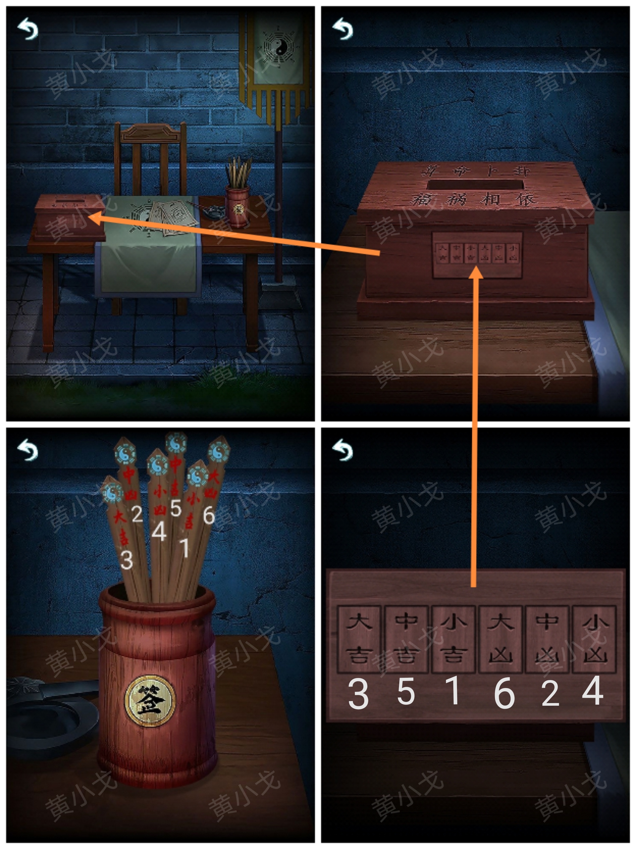 2.點擊攤位上的箱子,根據簽筒上的線索,按(小吉中凶大吉小凶中吉大凶)的順序按下木牌