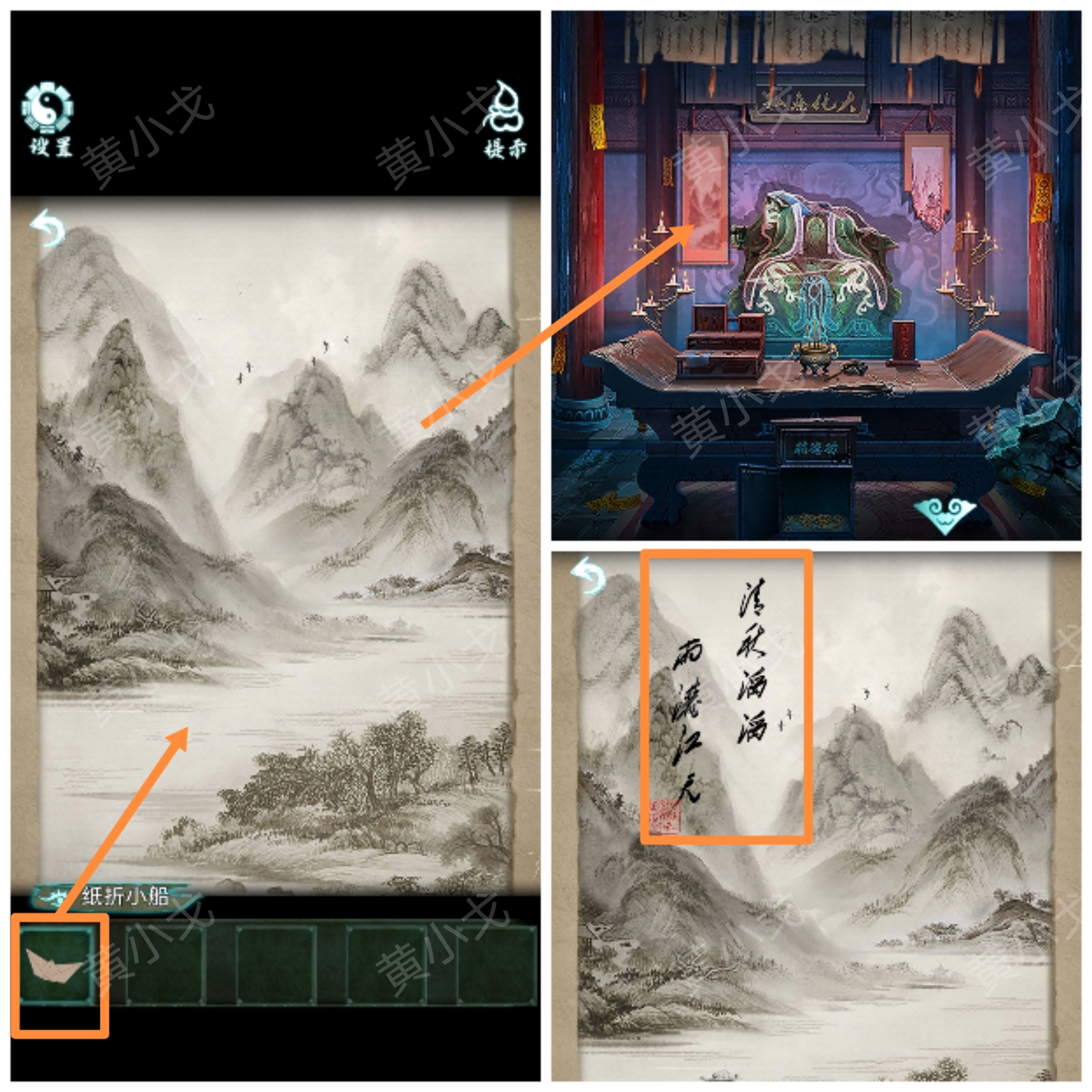 3.點擊左邊的挂畫,放上【折紙小船】,獲得線索(清秋滔滔,雨灑江天)