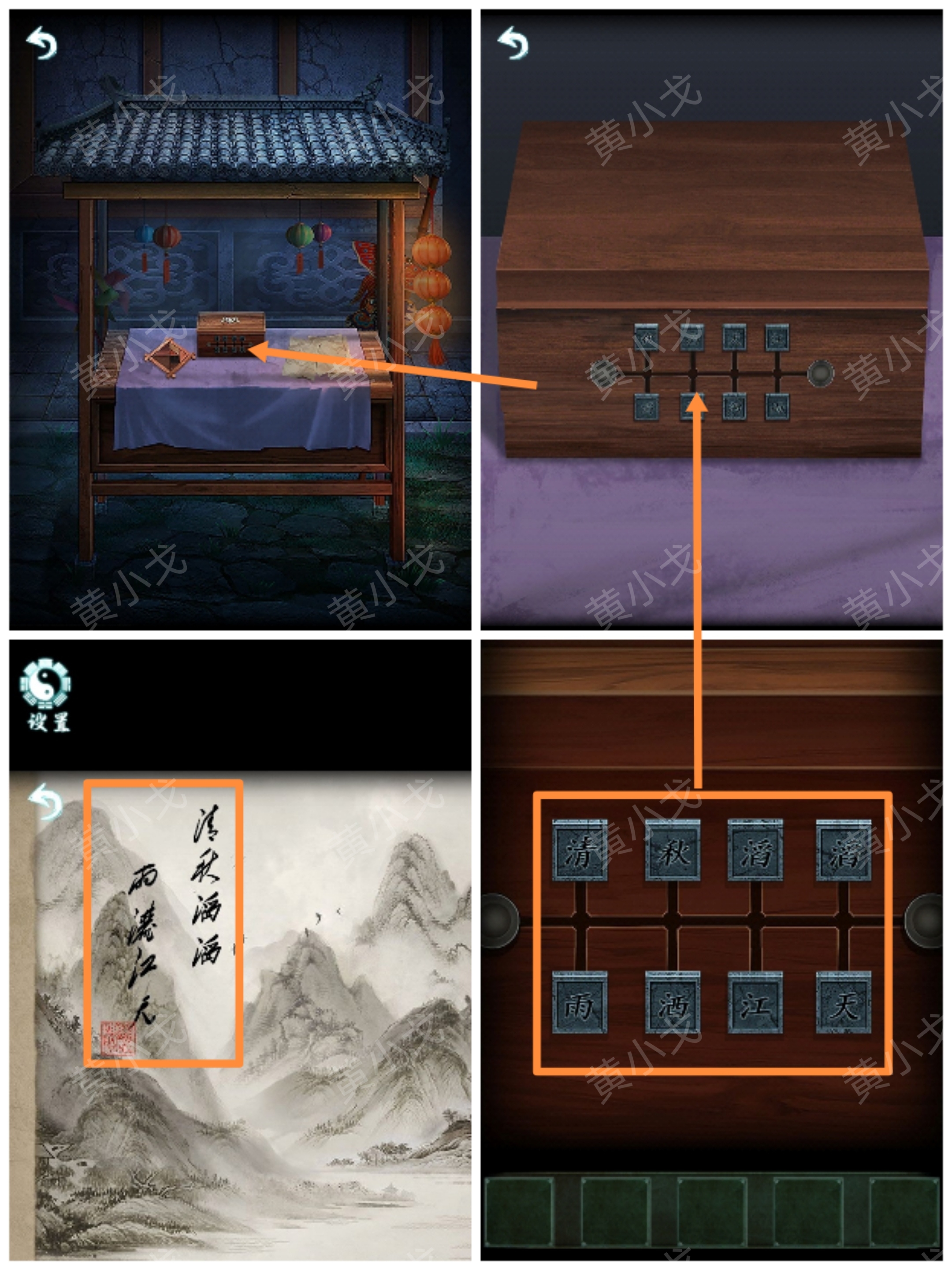4.(酆都)點擊右邊攤位上的盒子,根據挂畫上的線索,調整密碼鎖爲(清秋滔滔,雨灑江天)