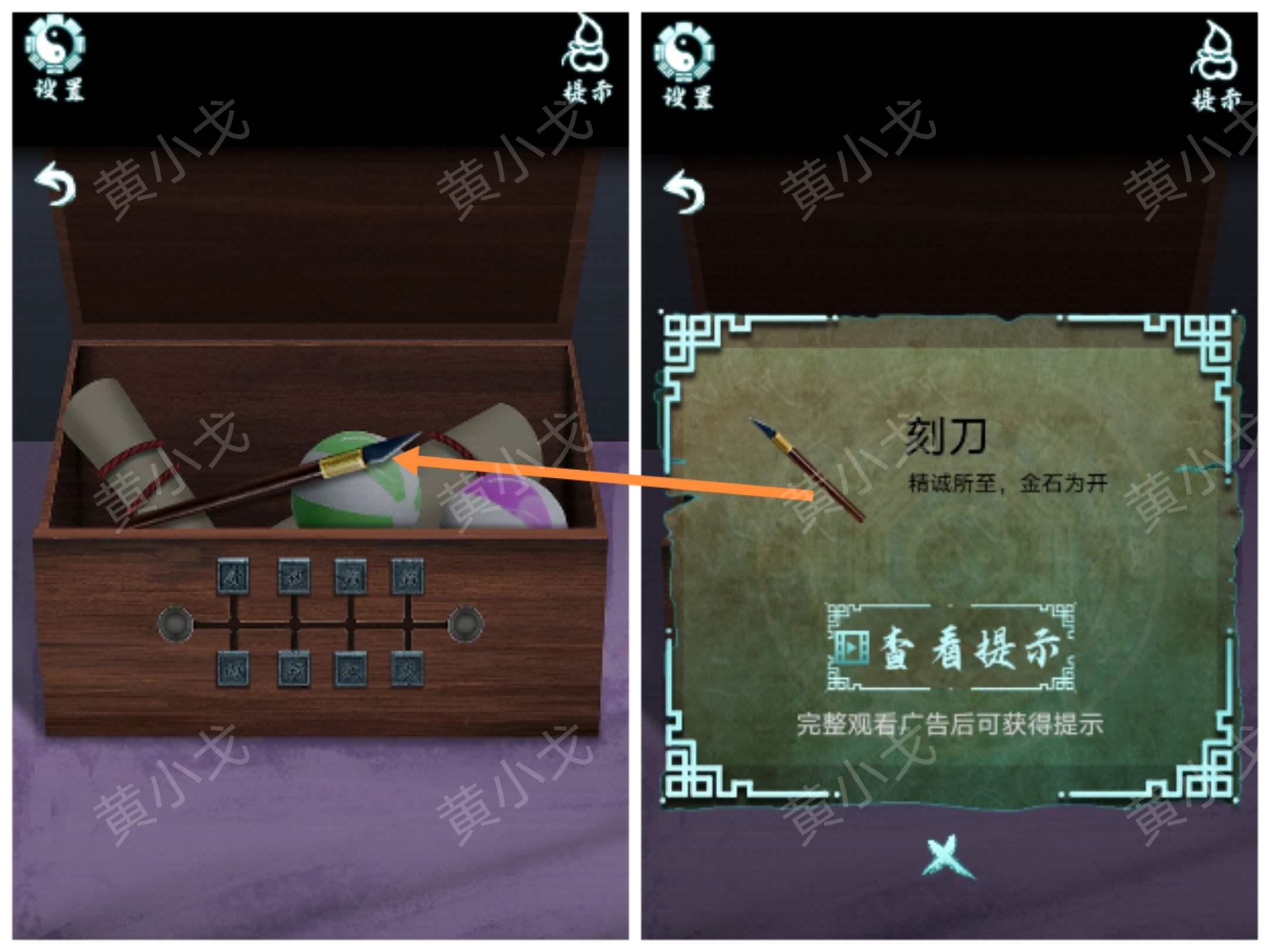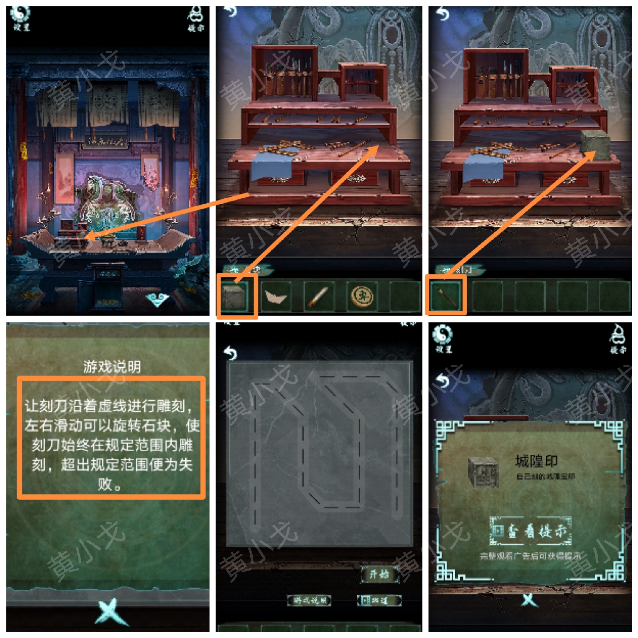 8.(城隍廟)點擊桌子上的雕刻工具箱,放上【石塊】,用【刻刀】雕刻;查看遊戲說明,完成小遊戲,獲得【城隍印】