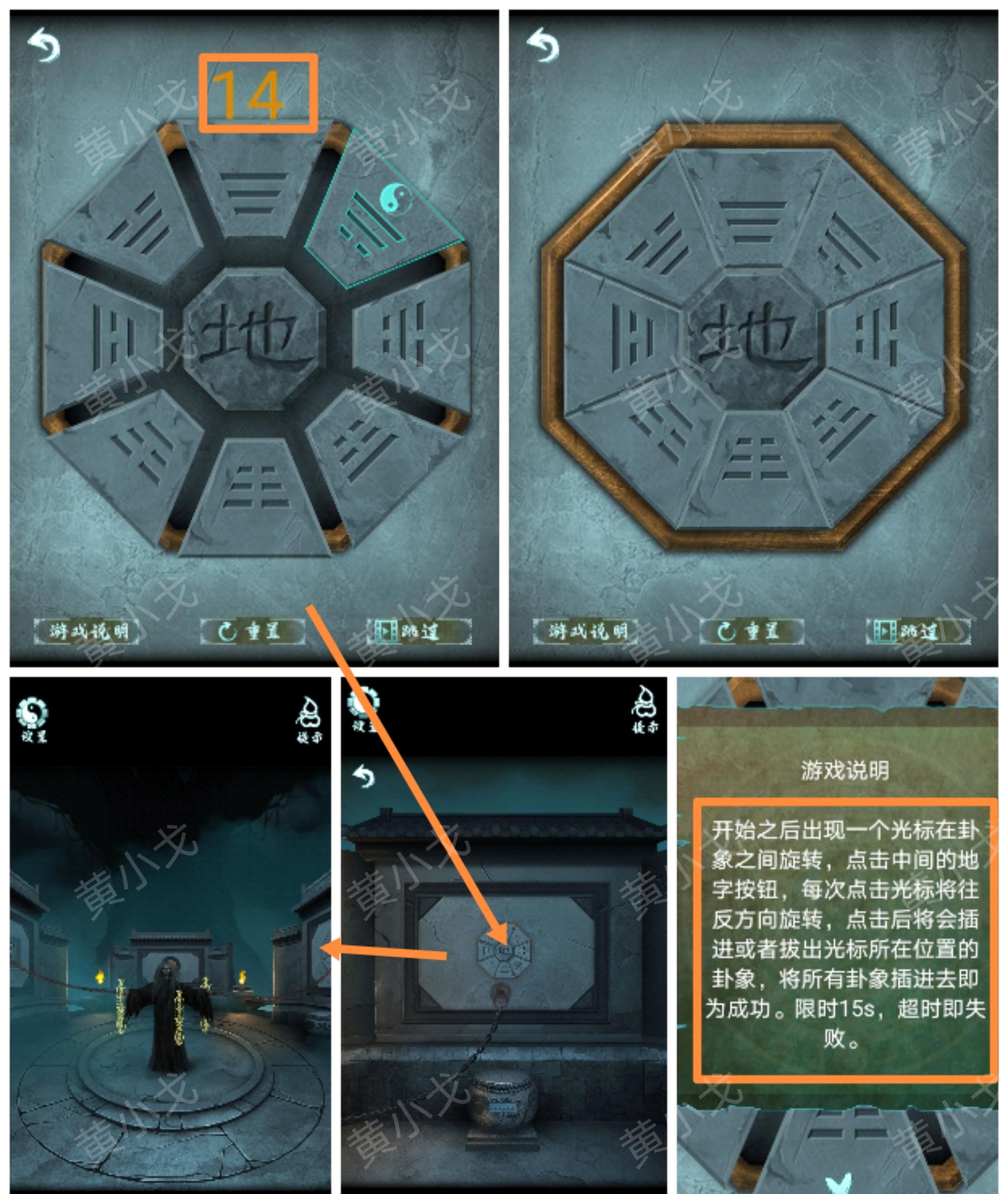 12.(桃止山)點擊右邊牆上的八卦封印,查看遊戲說明,完成小遊戲(限時15秒)