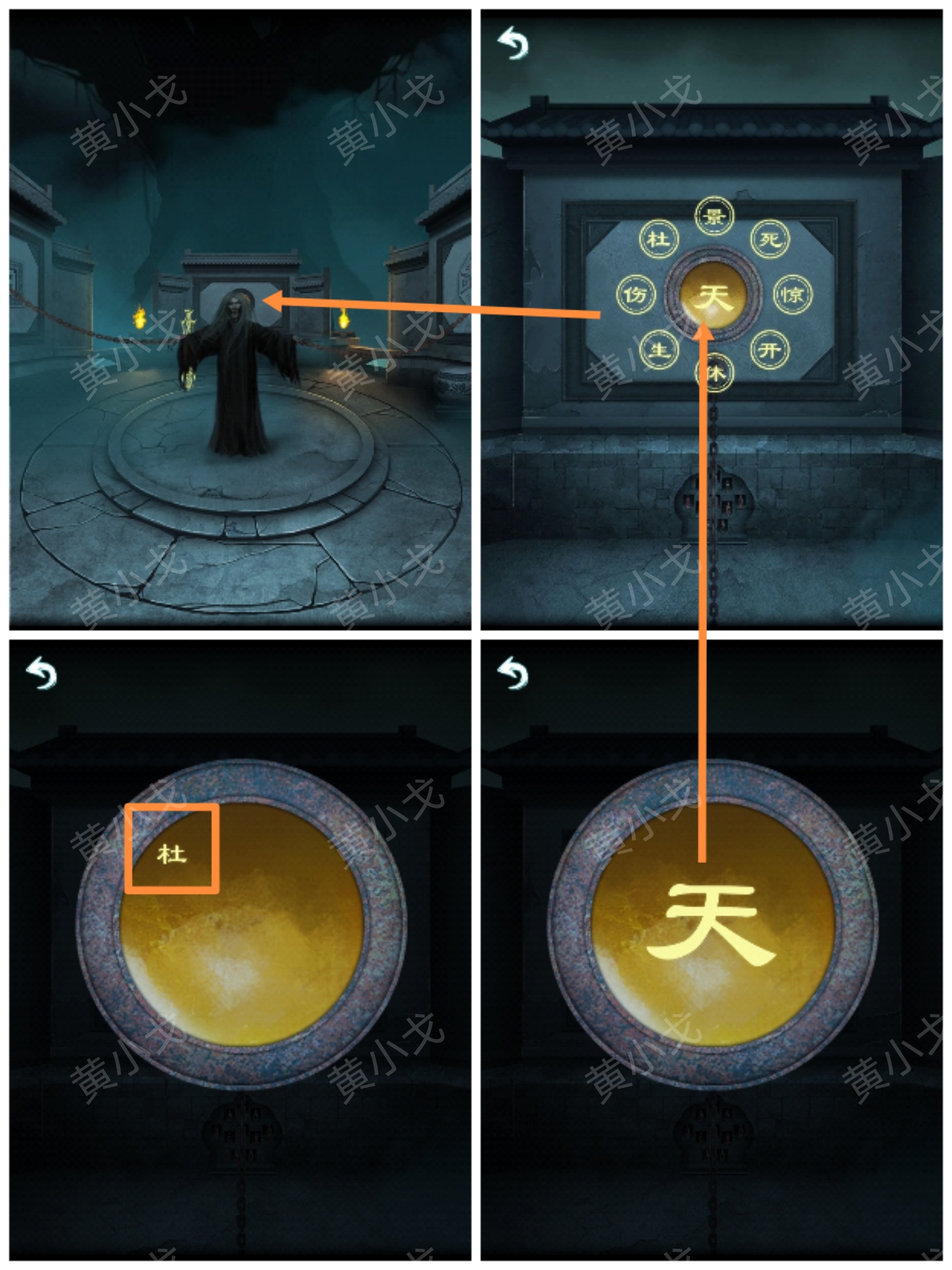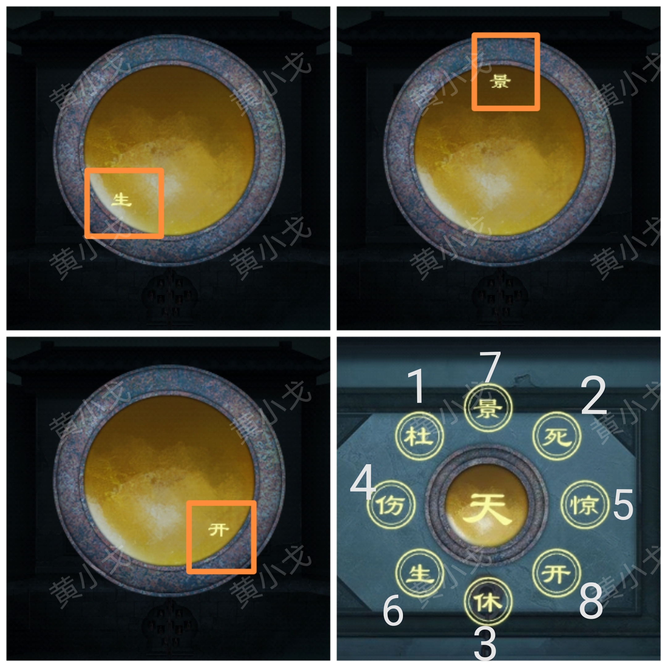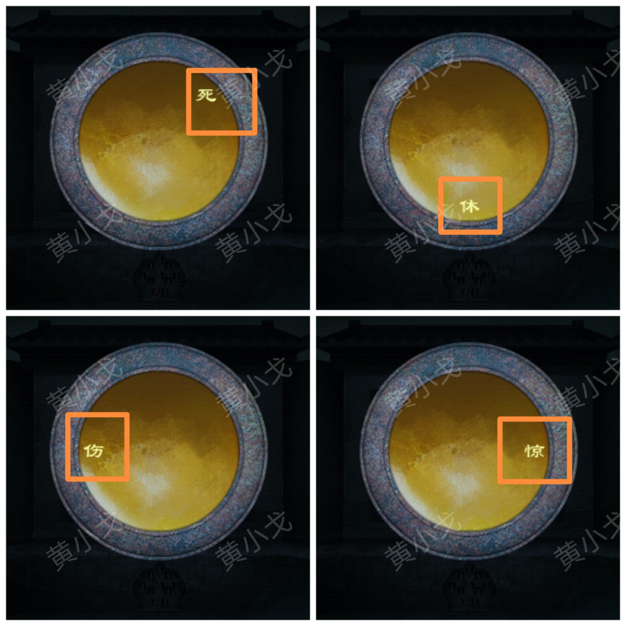 13.點擊中間牆上的封印,點擊封印中間的圓球,注意八門出現的順序(杜死休傷驚生景開);然後按這個順序點擊外圈的八門