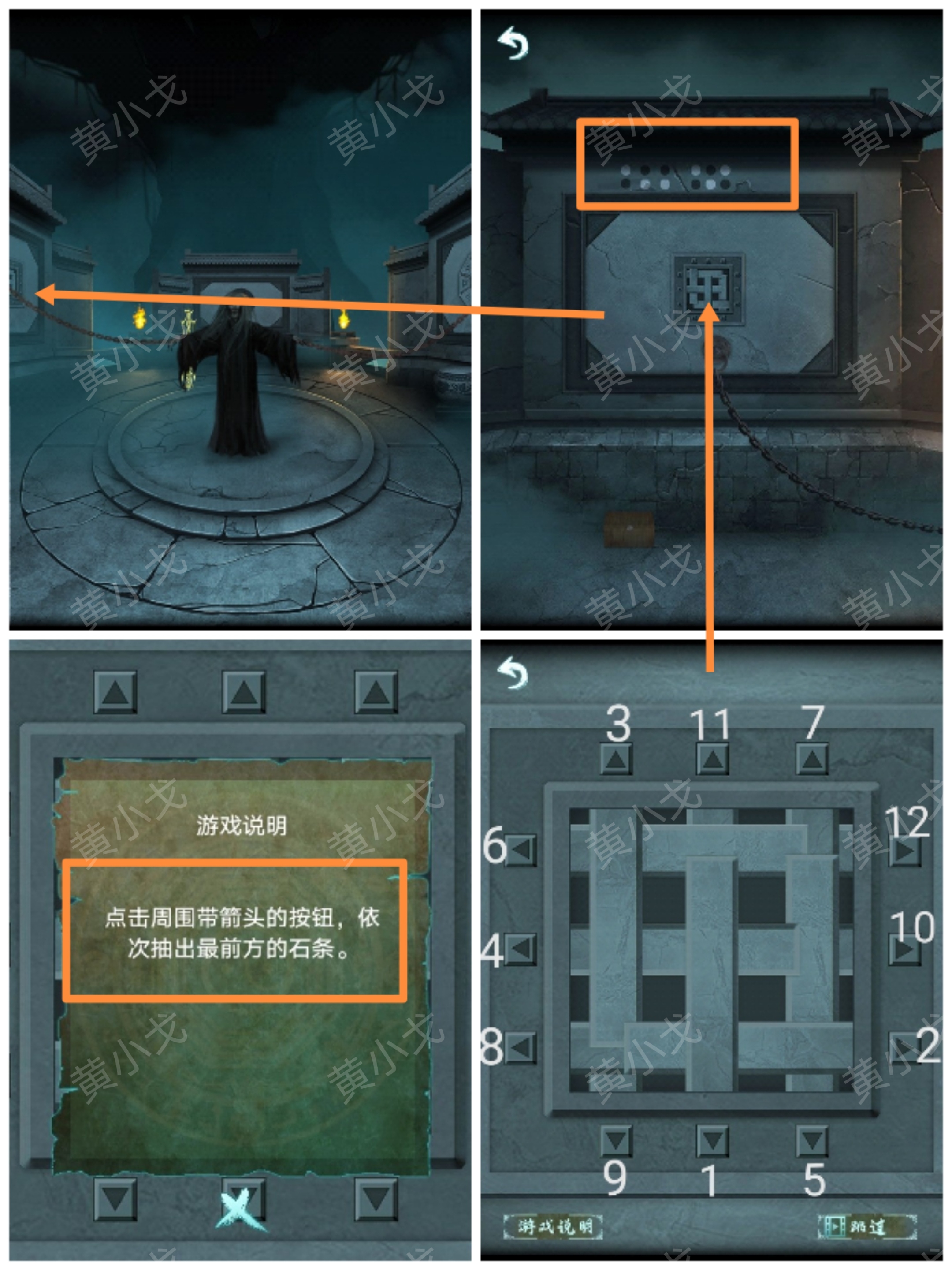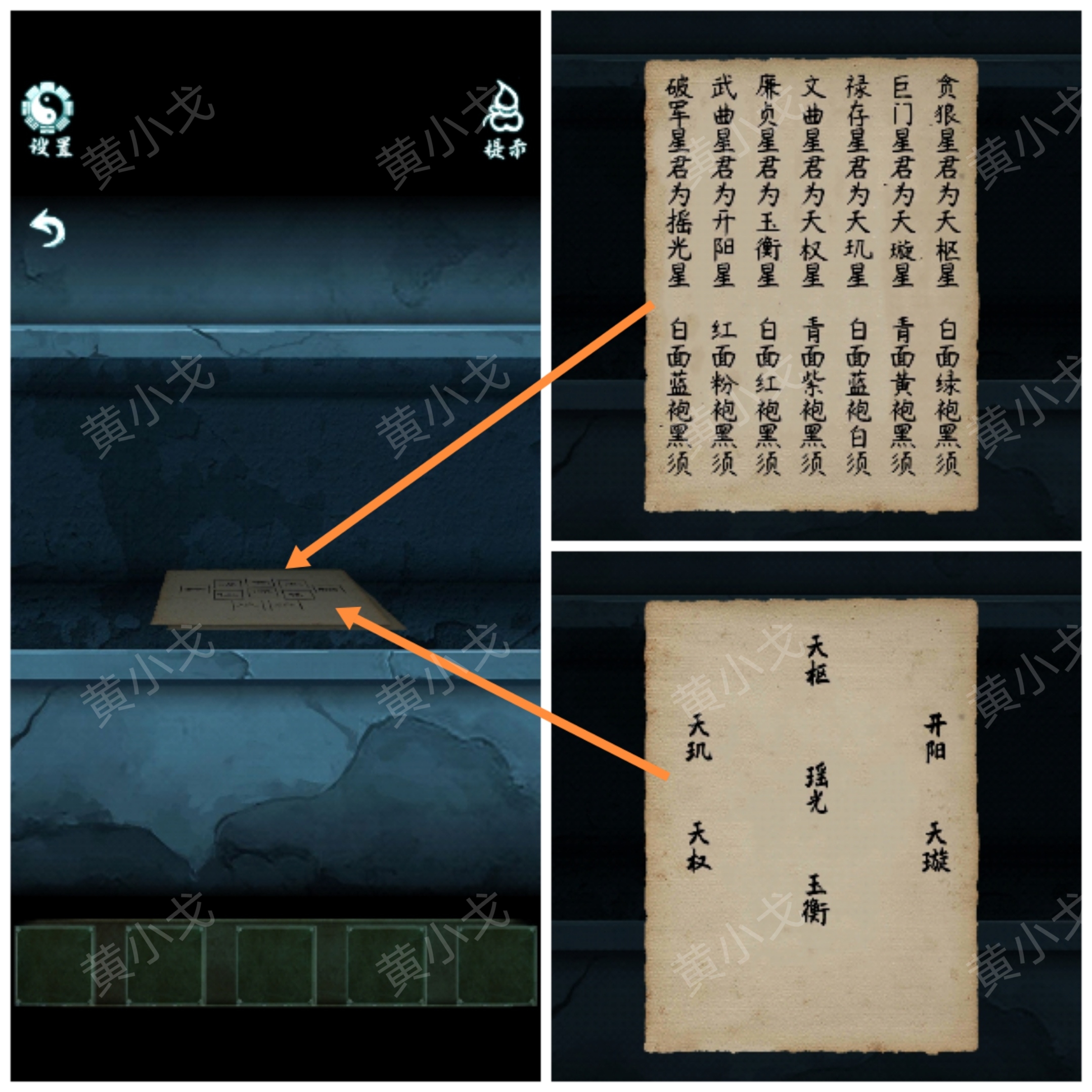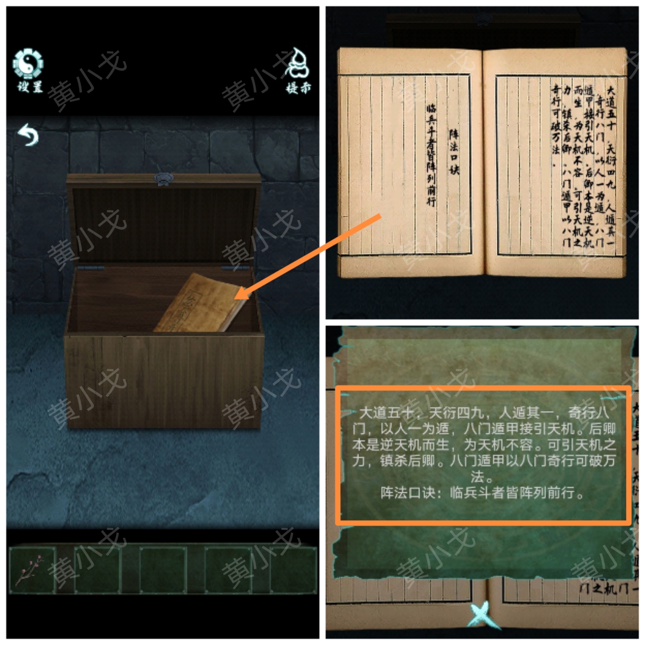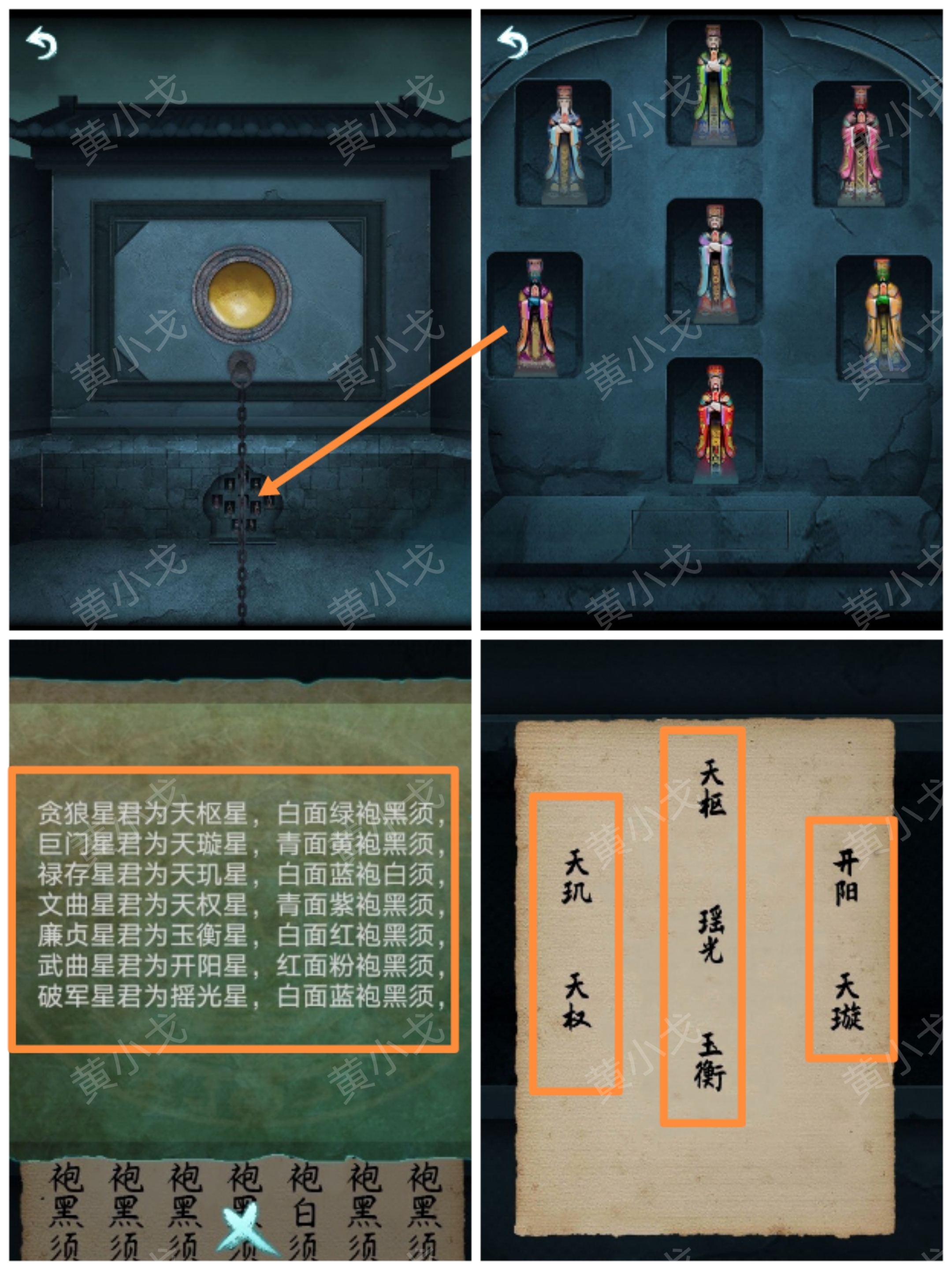 13.點擊中間牆上的封印,點擊封印中間的圓球,注意八門出現的順序(杜死休傷驚生景開);然後按這個順序點擊外圈的八門