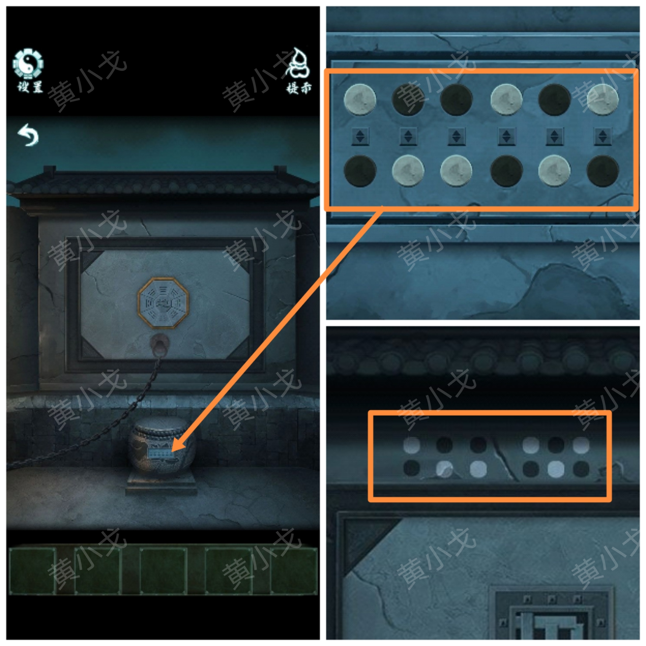14.點擊左邊牆上的封印,查看遊戲說明,完成小遊戲(注意牆上的圓點:白黑黑 白黑白、黑白白 黑白黑)