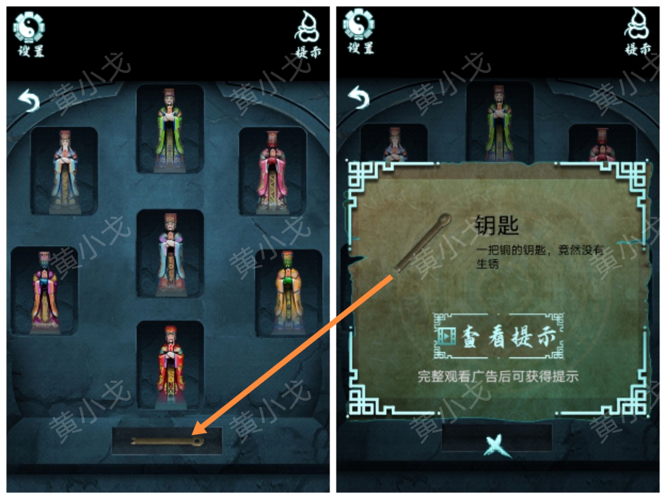 17.點擊中間牆上的機關,根據書上的線索,調整塑像的位置