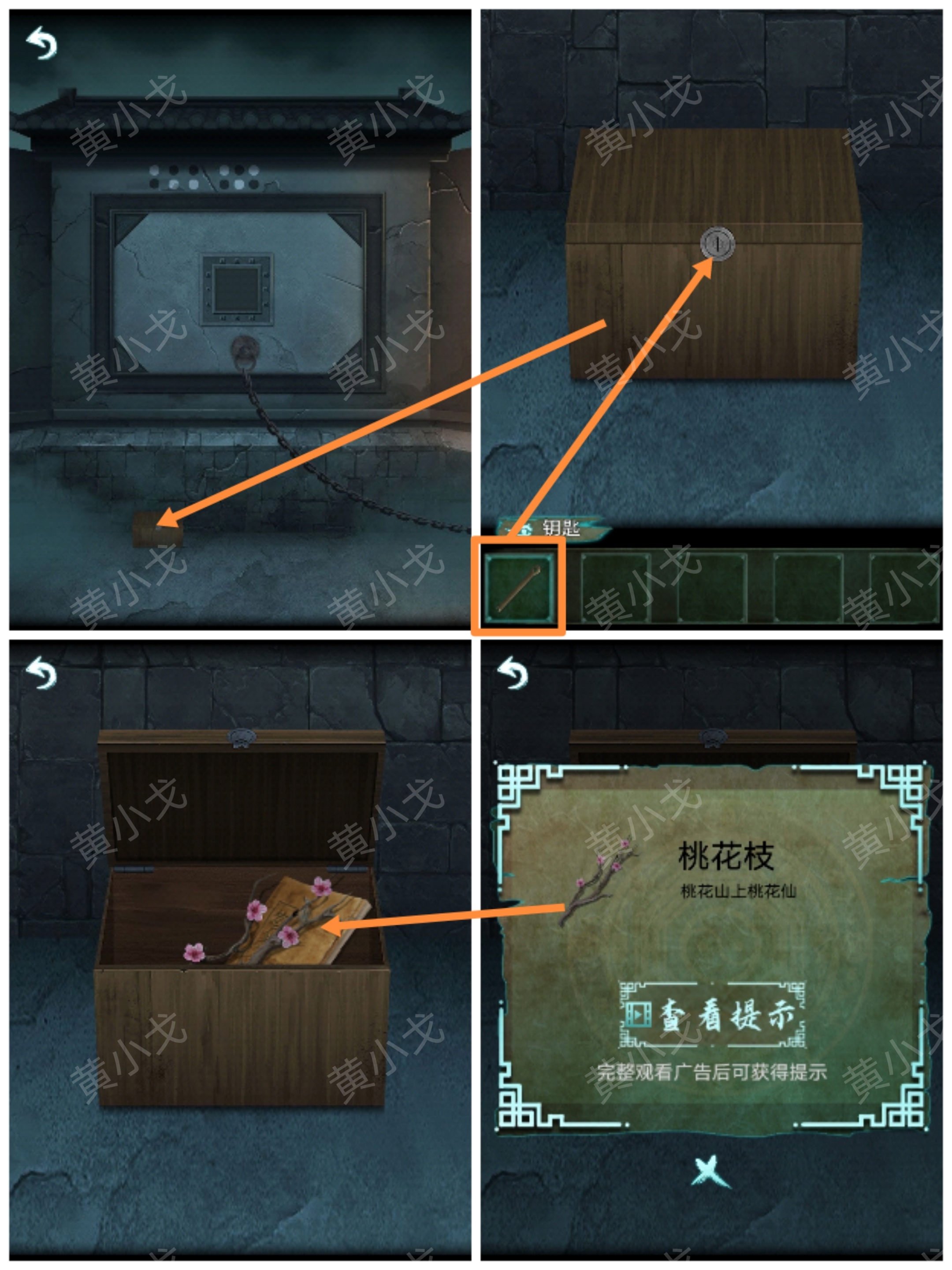 19.點擊左邊牆下的箱子,用【鑰匙】打開;獲得【桃花枝】