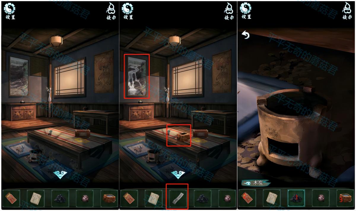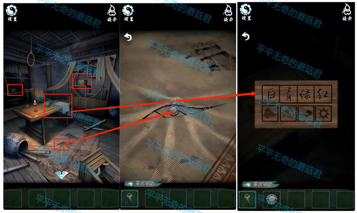 六、然後要鑰匙打開茶房,點擊第一張圖屏風位置,獲得密碼【3957】打開下圖櫃子的密碼,獲得木炭,再點擊中間圖位置的圖片位置,或者密碼【左右左左右左】,解開福字的門鎖,獲得【茶寵】,茶寵,是放入倒滿水的被子中