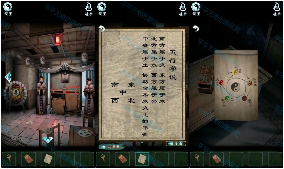 四、然後得到五髒紙紮,這是進入後面房間的關鍵物品,點擊下圖位置得到提示,然後按要求放置五髒的位置