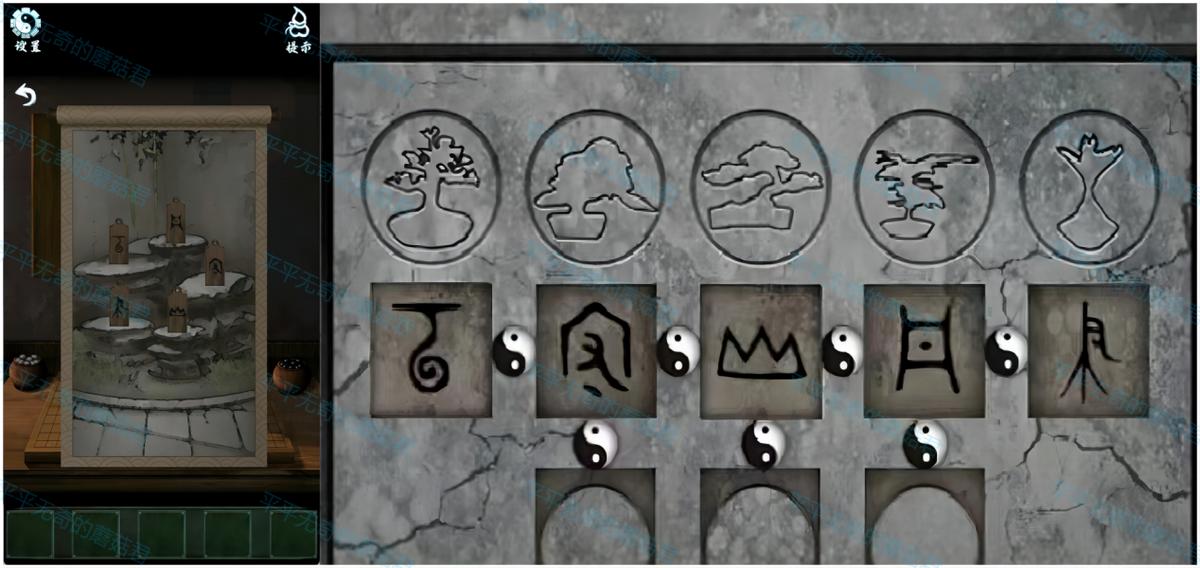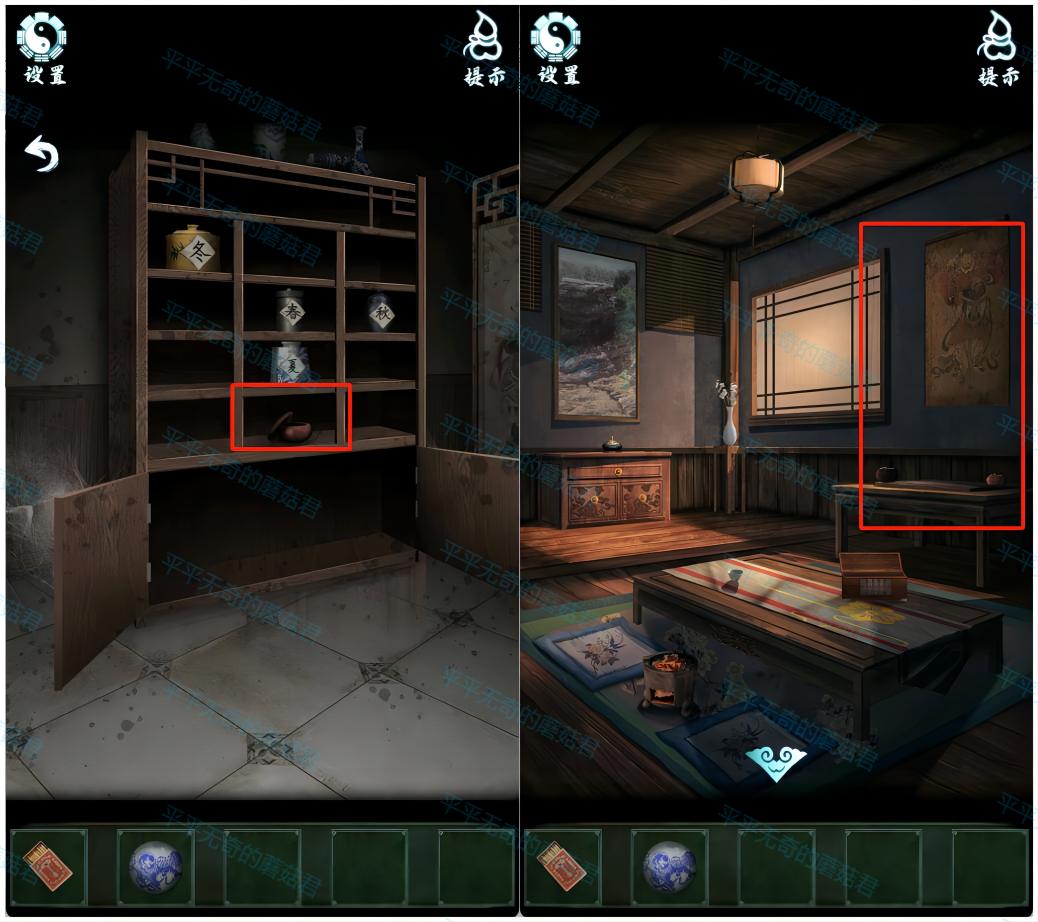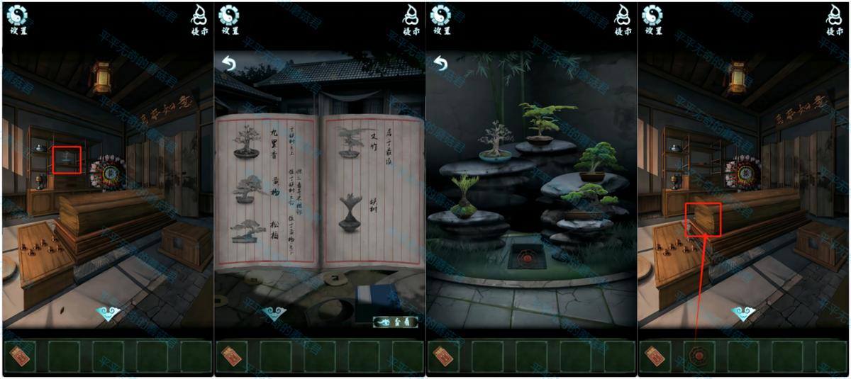 十一、打開正屋後,拿到盆栽,退出房間,來到假山上,放上盆栽,再根據之前的提示,移動盆栽的位置,然後獲得八卦盤,之後再來到棺材的凹槽處,放上八卦盒。