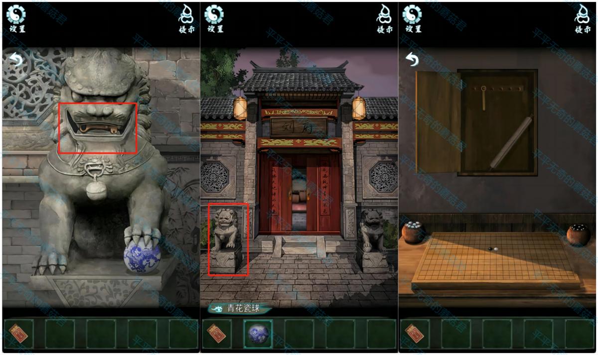十、之後帶著青花瓷球,來到門口,放入左邊的石獅子爪子下,獲得鑰匙,打開上一步對弈後燒毀的畫後的櫃子裏。得到【正屋的鑰匙】跟一幅畫,後面會用到。
