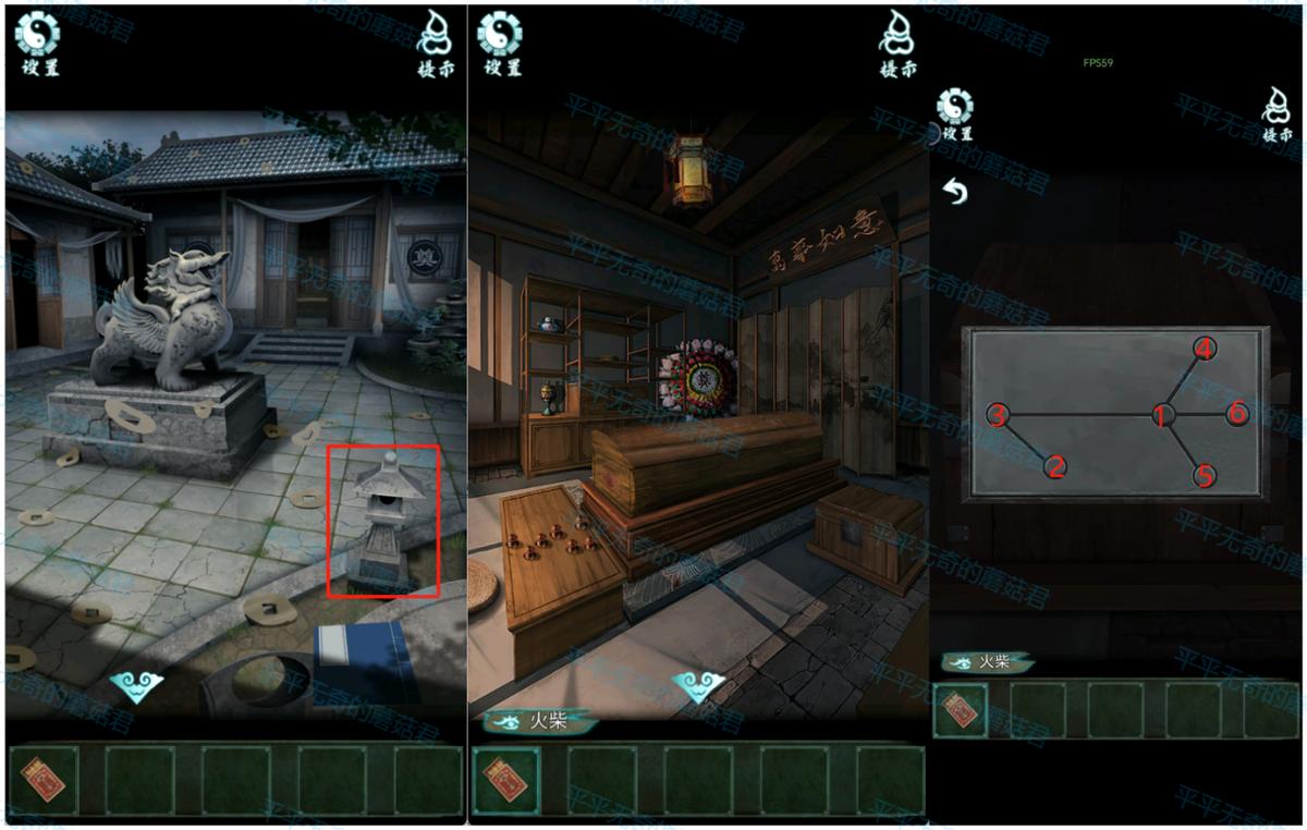 十二、之後來到院子之中,點燃其中的石燈,然後根據石燈亮起的順序,按壓正屋之中箱子的密碼鎖。然後獲得燈籠。