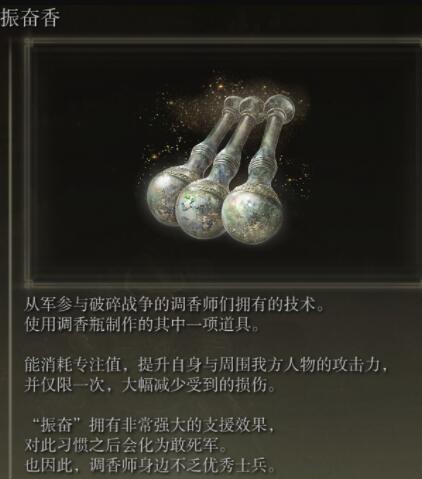 調香瓶效果介紹: 艾爾登法環中的調香瓶是儲存香藥的必備道具,玩家可以使用調香瓶來制作和攜帶各種具有不同效果的香藥。 香藥效果: 振奮香:能夠獲得一層90%減傷的護盾和增加10%攻擊力的BUFF,這是一種非常實用的效果,而且是群體性的,對于戰鬥中的生存和輸出都有極大的幫助。 狂熱香藥:據測試,這個香藥能增加大約30%的輸出,效果非常顯著。但需要注意的是,同時也會增加受到的損傷,因此在使用時需要權衡利弊。 鐵壺香藥:類似于魂系列中的鐵身軀效果,大幅度增加減傷和抵抗,但會使角色移動緩慢、翻滾困難,並且雷抗性直接變爲負數。這個效果大約持續15-20秒,適用于一些需要承受大量傷害的戰鬥場景。