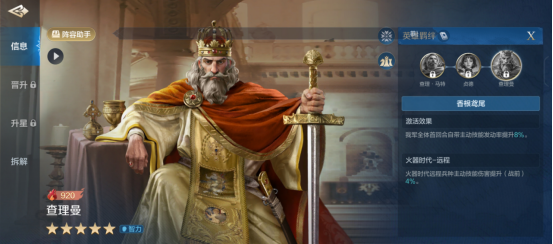 世界啓元中,如果玩家能抽到查理曼大帝,那麽智力輸出隊算是有了保障,查理曼在智力輸出方面絕對算得上名列前茅,值得培養。