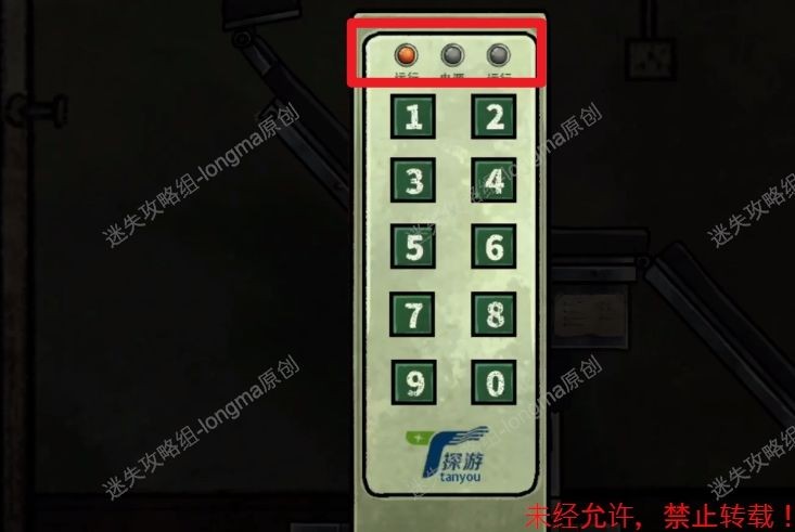 70.回到第一個屋子,點擊電箱,依據觀察機械椅上的顯示燈密碼:左紅、中綠、左綠、右紅、中紅、右綠,先後點擊電箱上紅綠按鍵。70