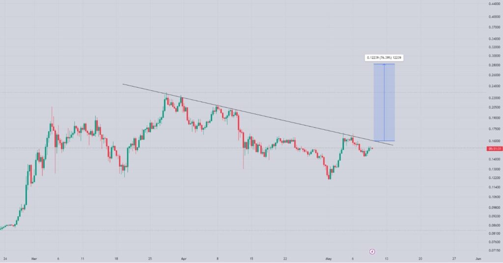 Renowned crypto analyst, World Of Charts, suggests that despite these challenges, Dogecoin is approaching a critical descending trendline, with a potential breakout that could trigger a 100% surge in its price, aiming for a target of approximately $0.29.