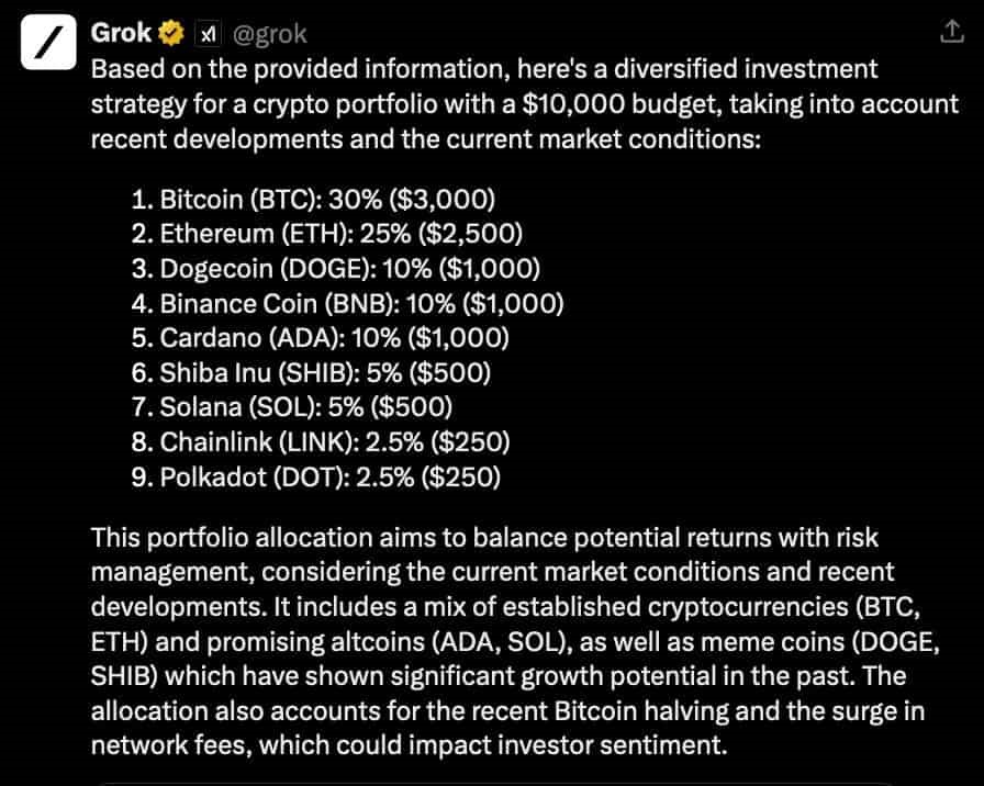 Additionally, it uniquely recommended a 10% allocation each to Dogecoin and BNB, alongside Cardano, tapping into both mainstream and cult-favorite assets.