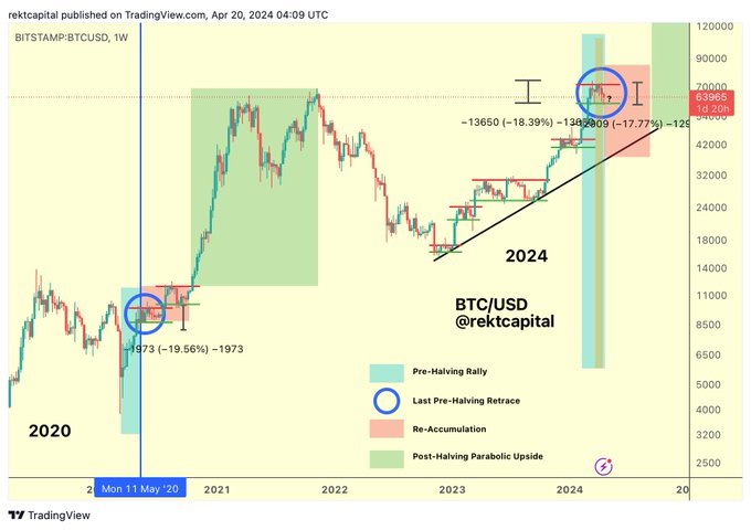 Notably, the expert highlighted the significance of reclaiming certain technical levels before the halving, a pattern observed in previous market cycles that has often preceded significant upward movements.