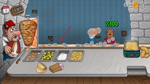 答在第一天准備配菜,點擊長刀割肉,長按土豆切條,點擊餅皮,卷起來點擊紙袋即可