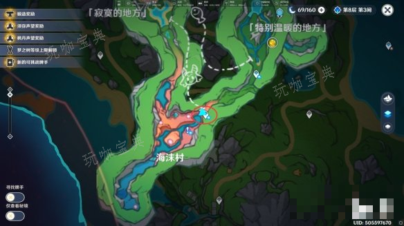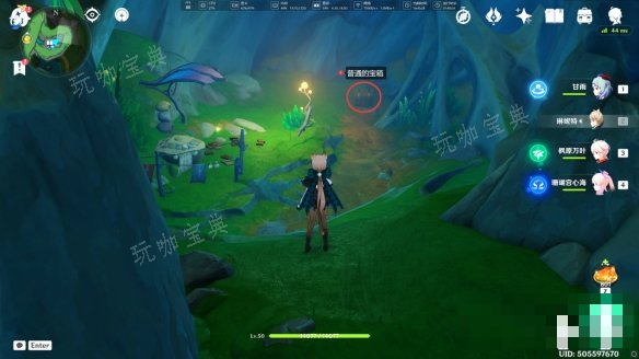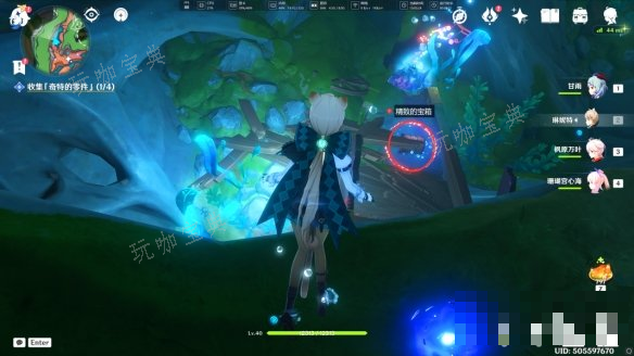 最後我們拾取水種子,站在三個水量偵測晶體的中間位置,等待水種子成長爲水之核後,即可激活水量偵測晶體,之後開啓精致的寶箱,獲得1個「奇特的零件」