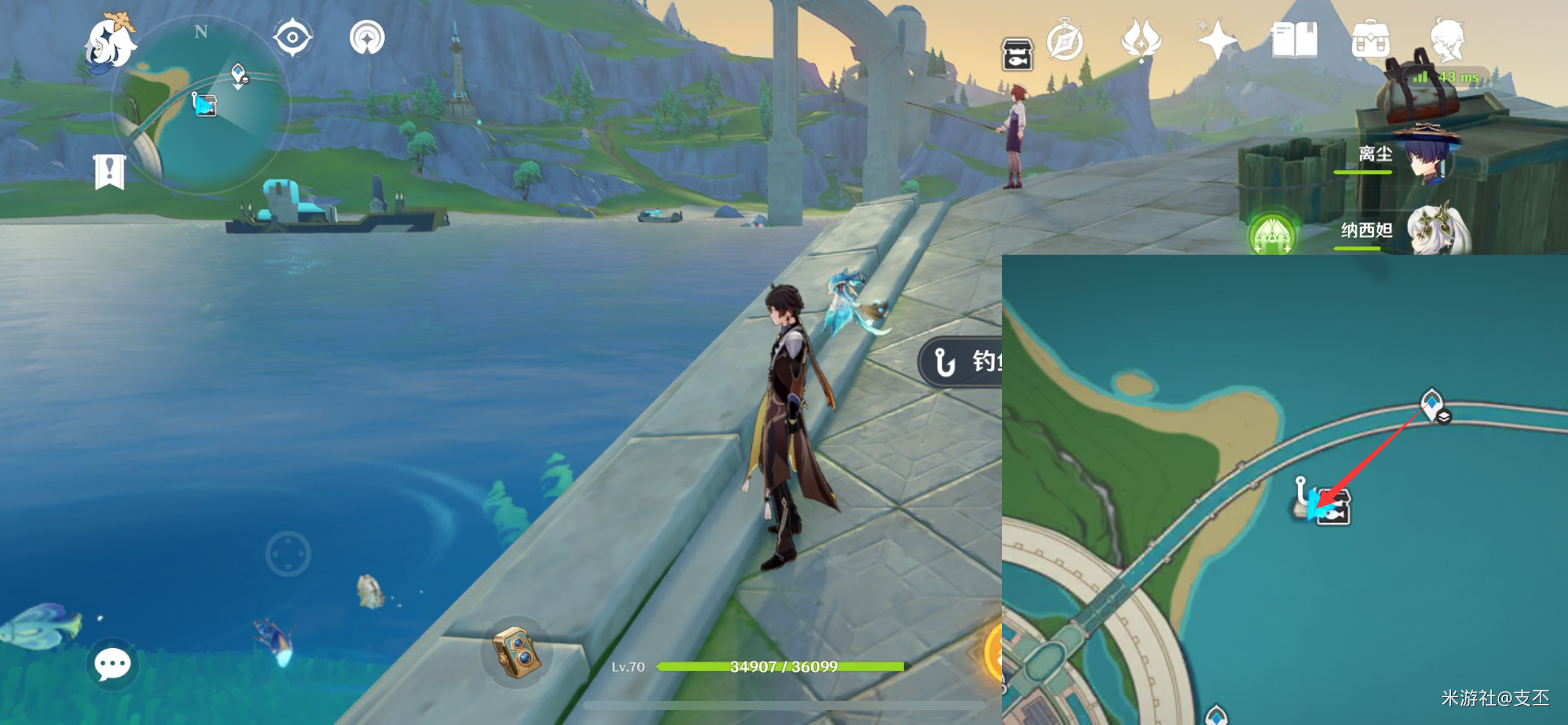 來到楓丹釣魚協會,在旁邊的釣魚點釣起一條魚