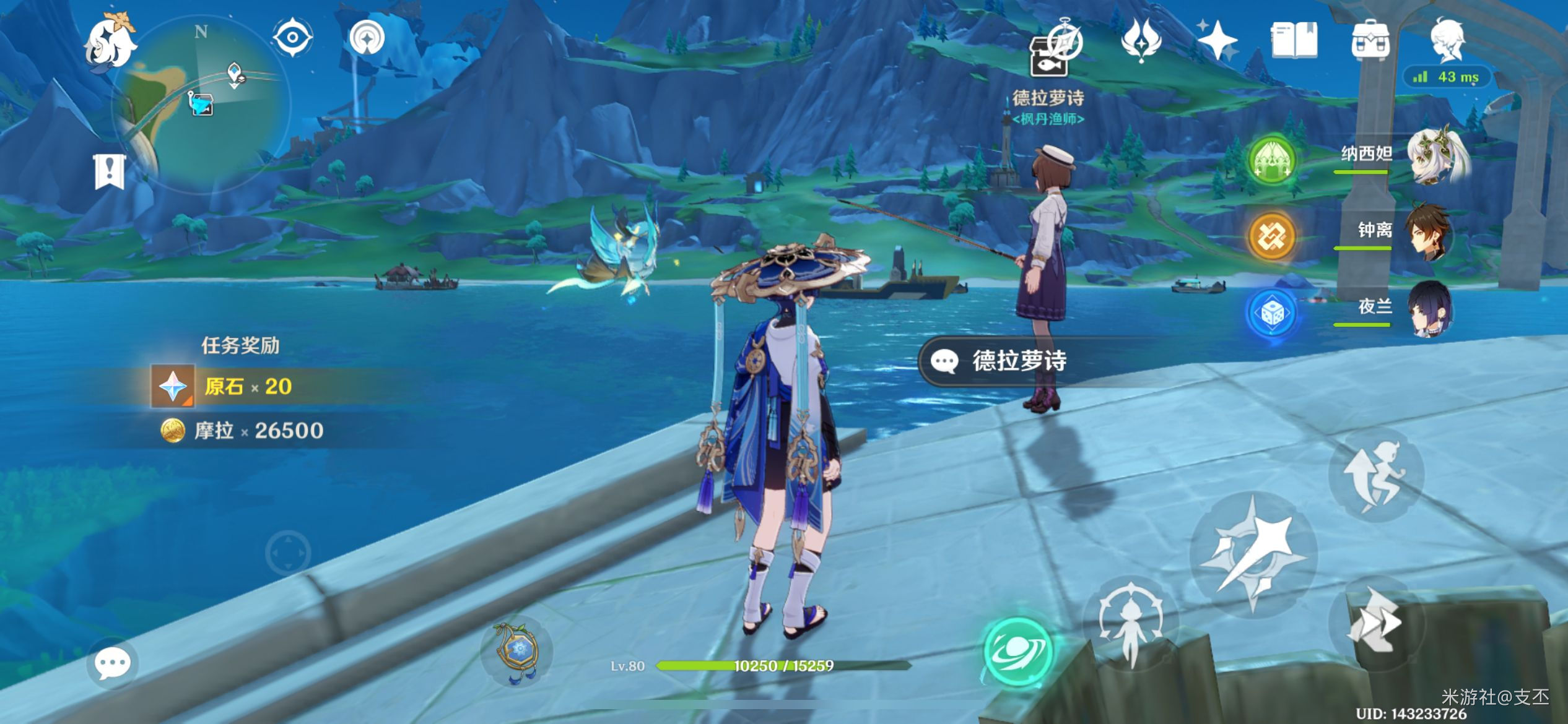 之後退出釣魚,會自動觸發與上方楓丹漁師德拉蘿詩的對話