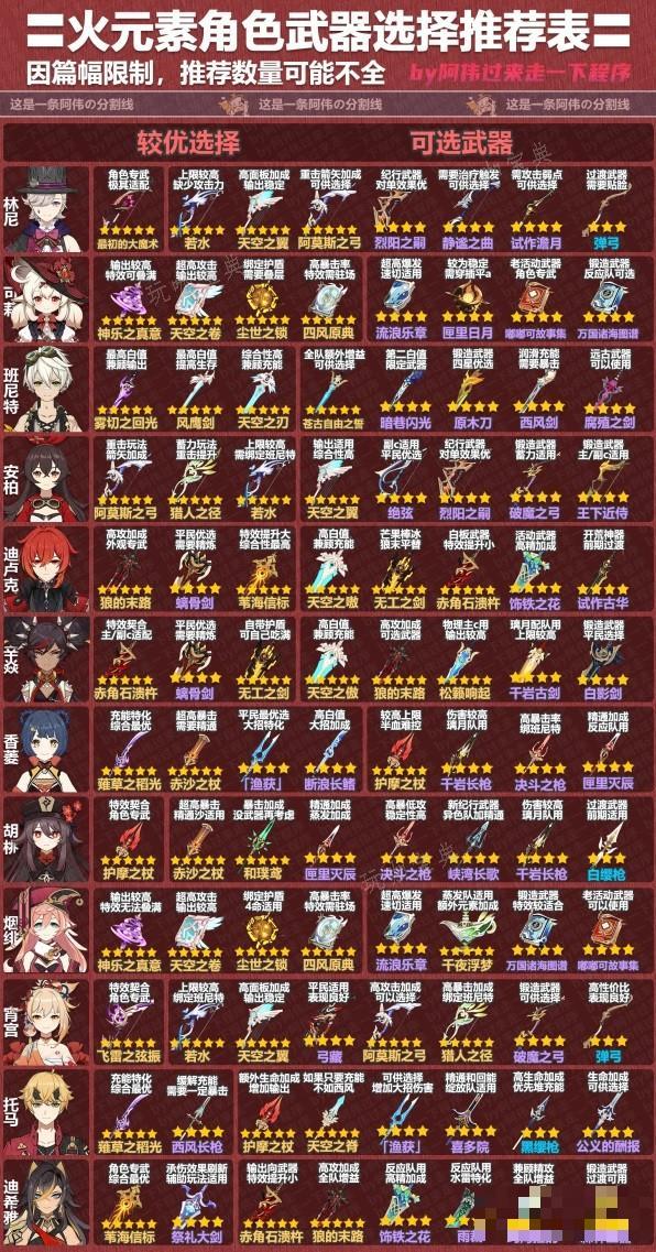 ◆你們會發現各表上用“較優選擇”和“可選武器”分開標注,一般來說前者爲五星武器或角色專武等使用表現較好的選擇,後者則稍次之。